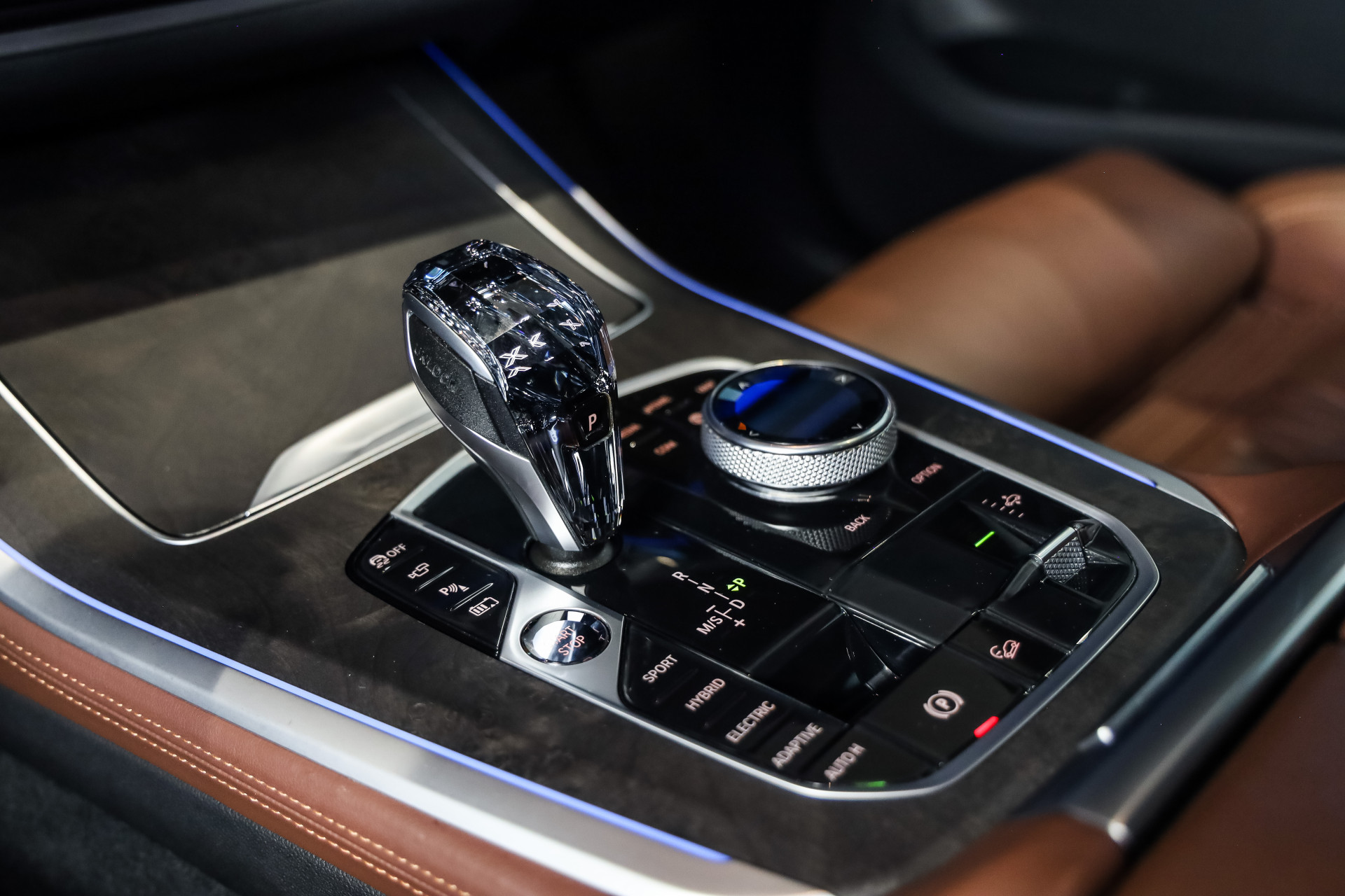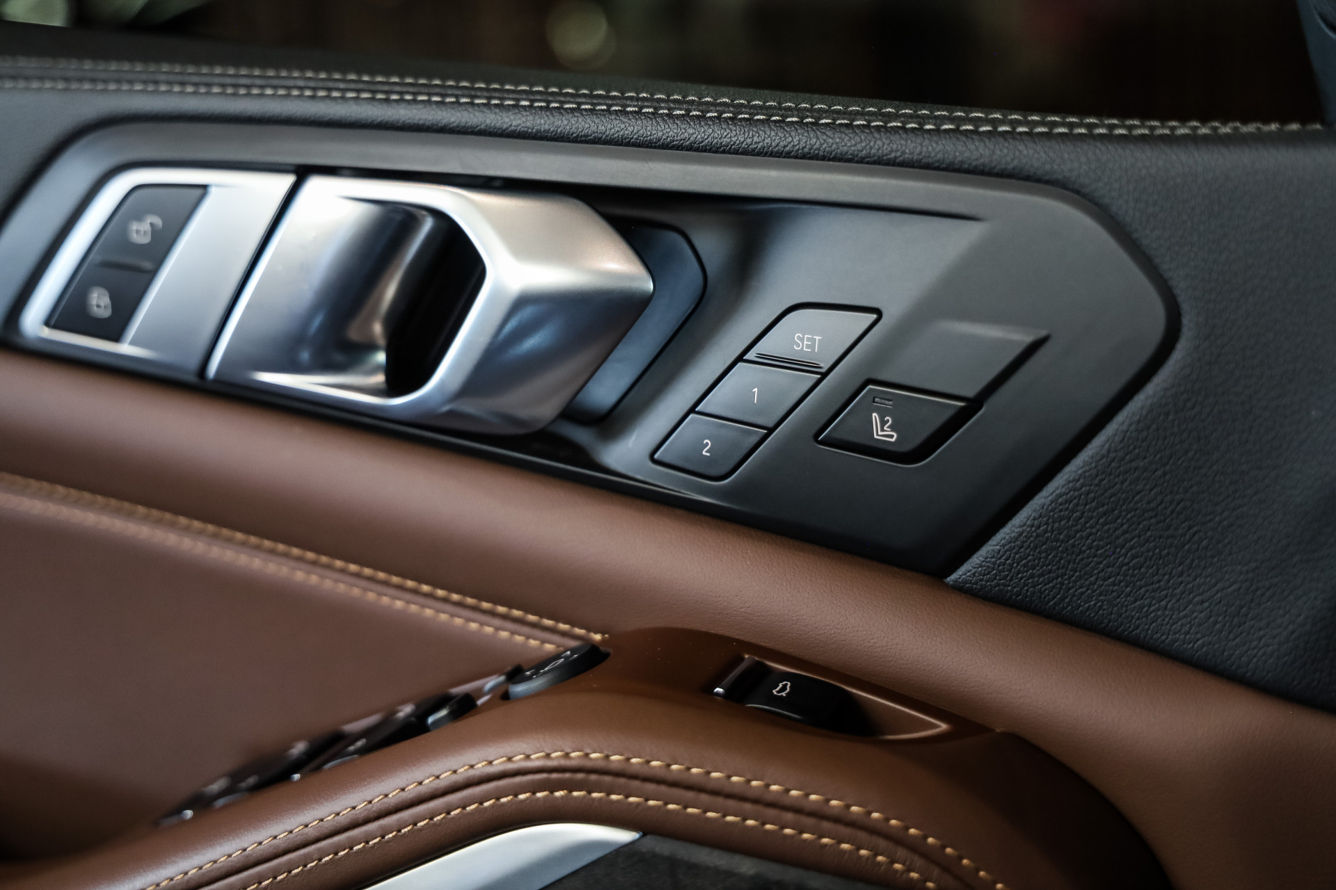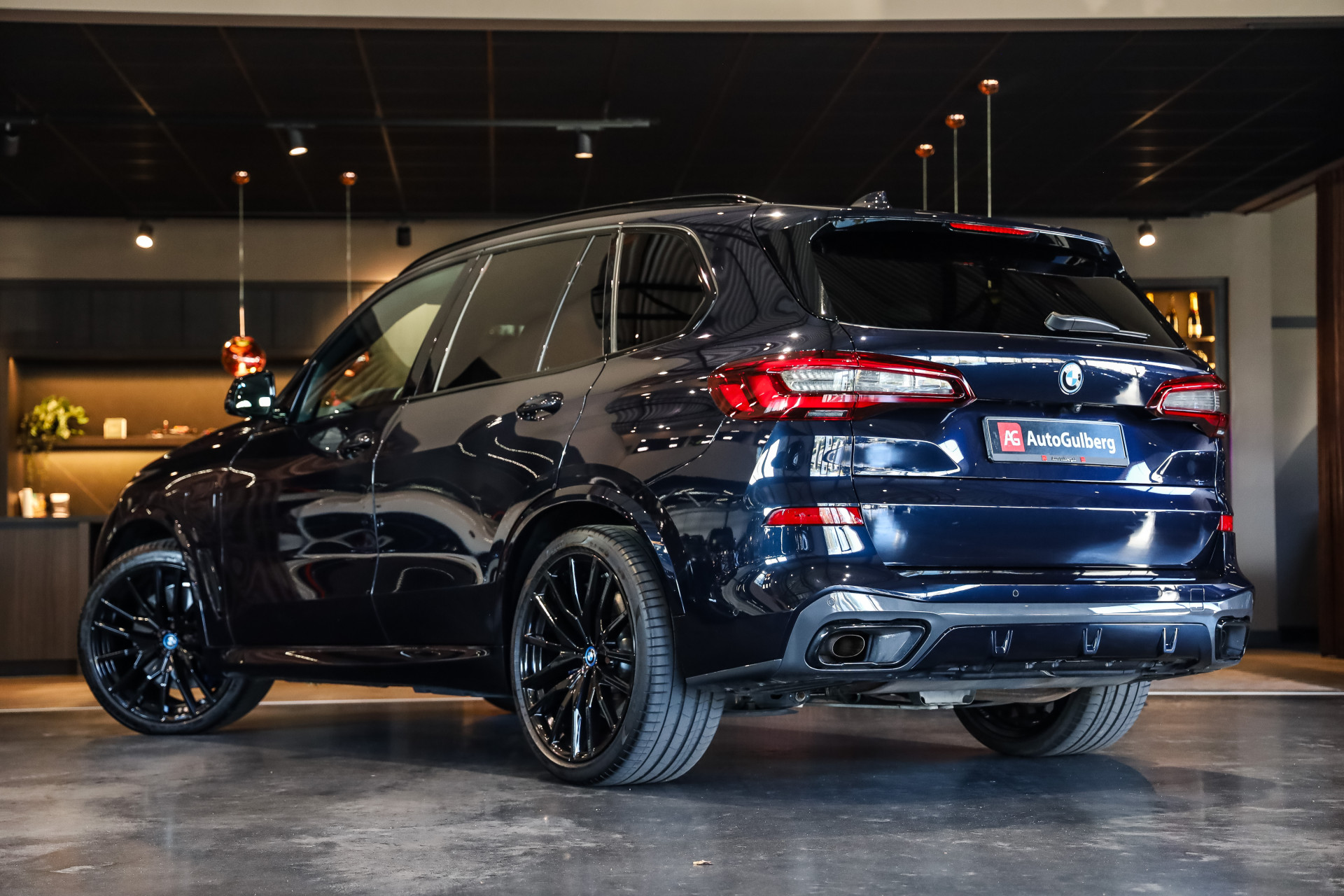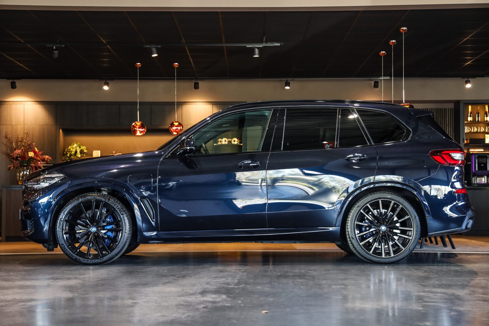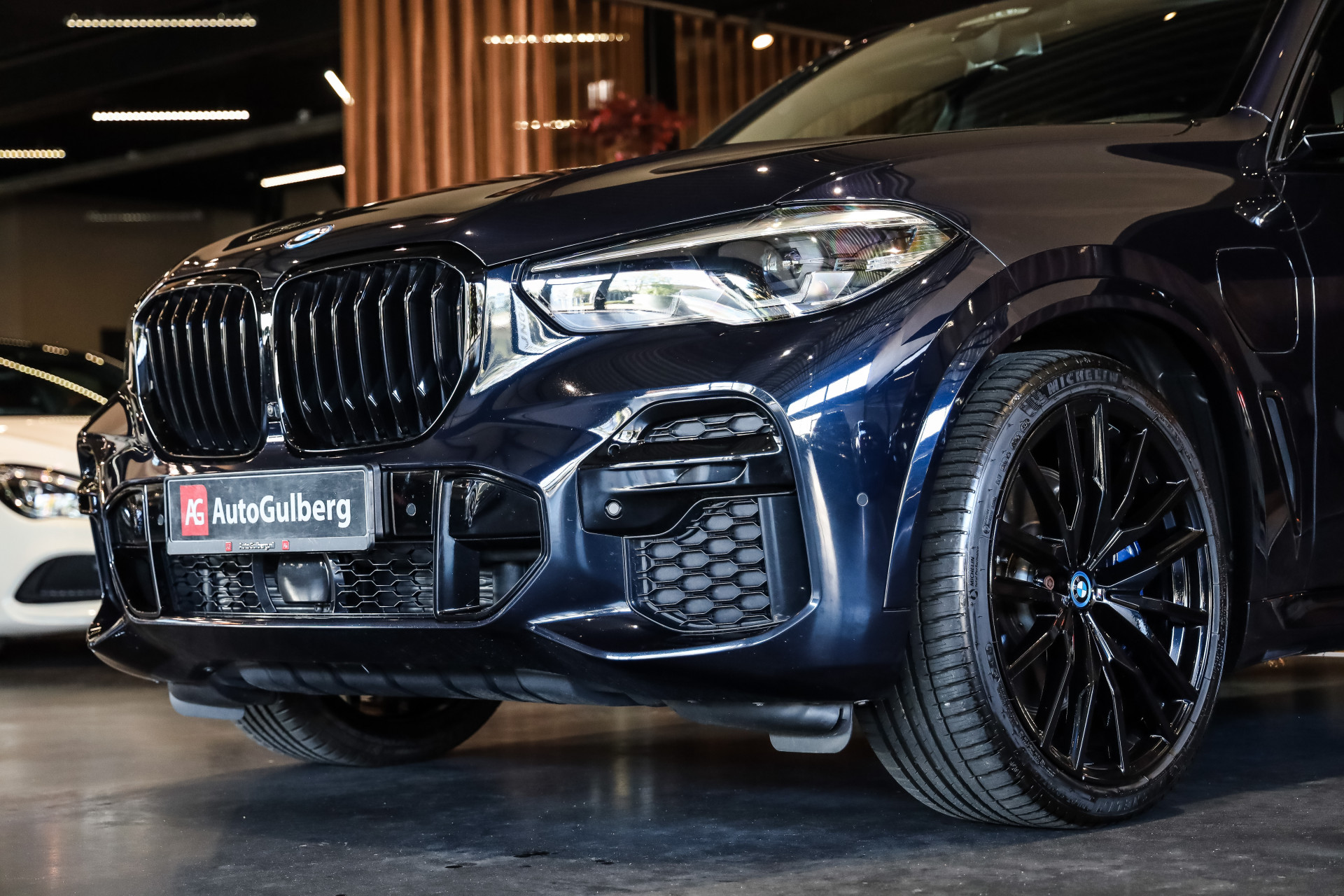 BMW X5 45e M-Sport in de kleur Carbonzwart met uitgebreid Merino leder pakket in de kleur Coffee, de buitenzijde is geheel afgewerkt in Black Optic accenten en velgen.