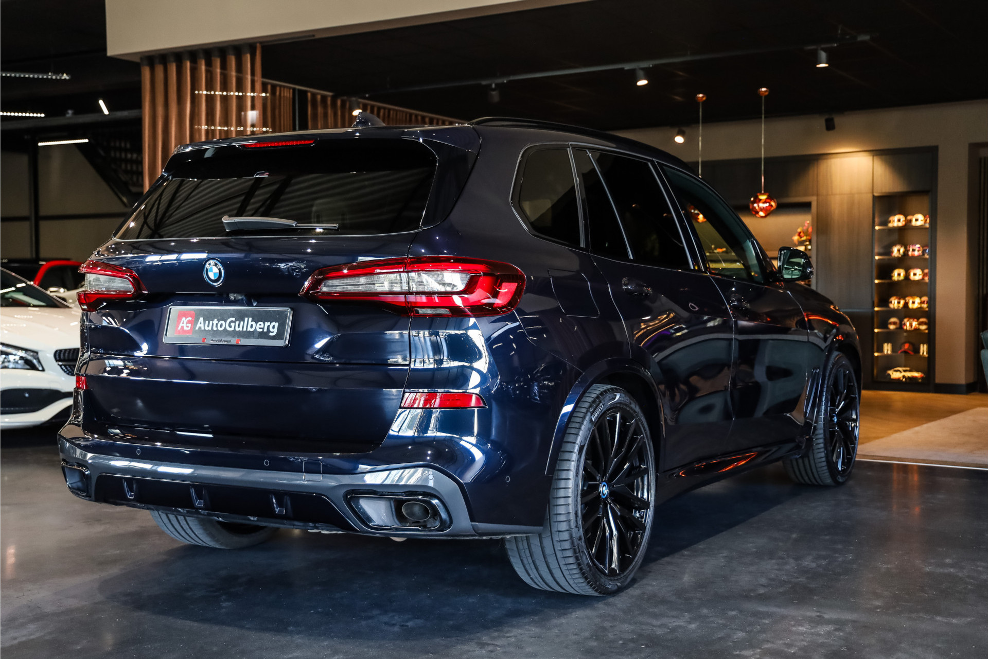 BMW X5 45e M-Sport in de kleur Carbonzwart met uitgebreid Merino leder pakket in de kleur Coffee, de buitenzijde is geheel afgewerkt in Black Optic accenten en velgen.