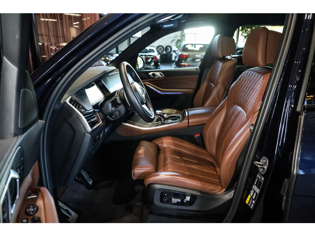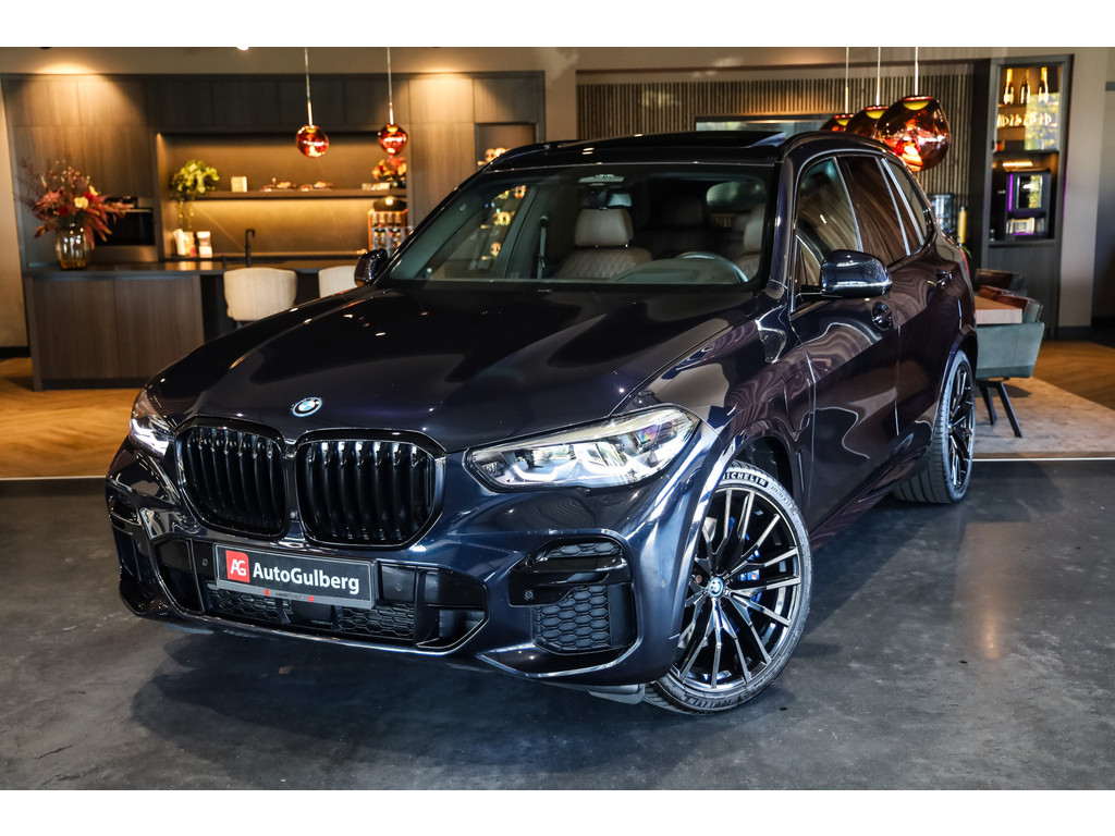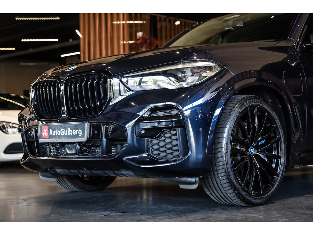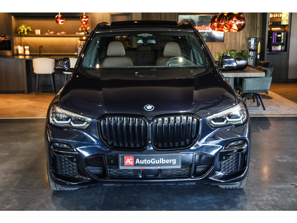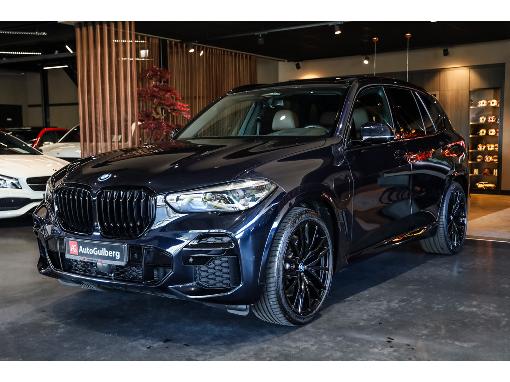 BMW X5 45e M-Sport in de kleur Carbonzwart met uitgebreid Merino leder pakket in de kleur Coffee, de buitenzijde is geheel afgewerkt in Black Optic accenten en velgen.
