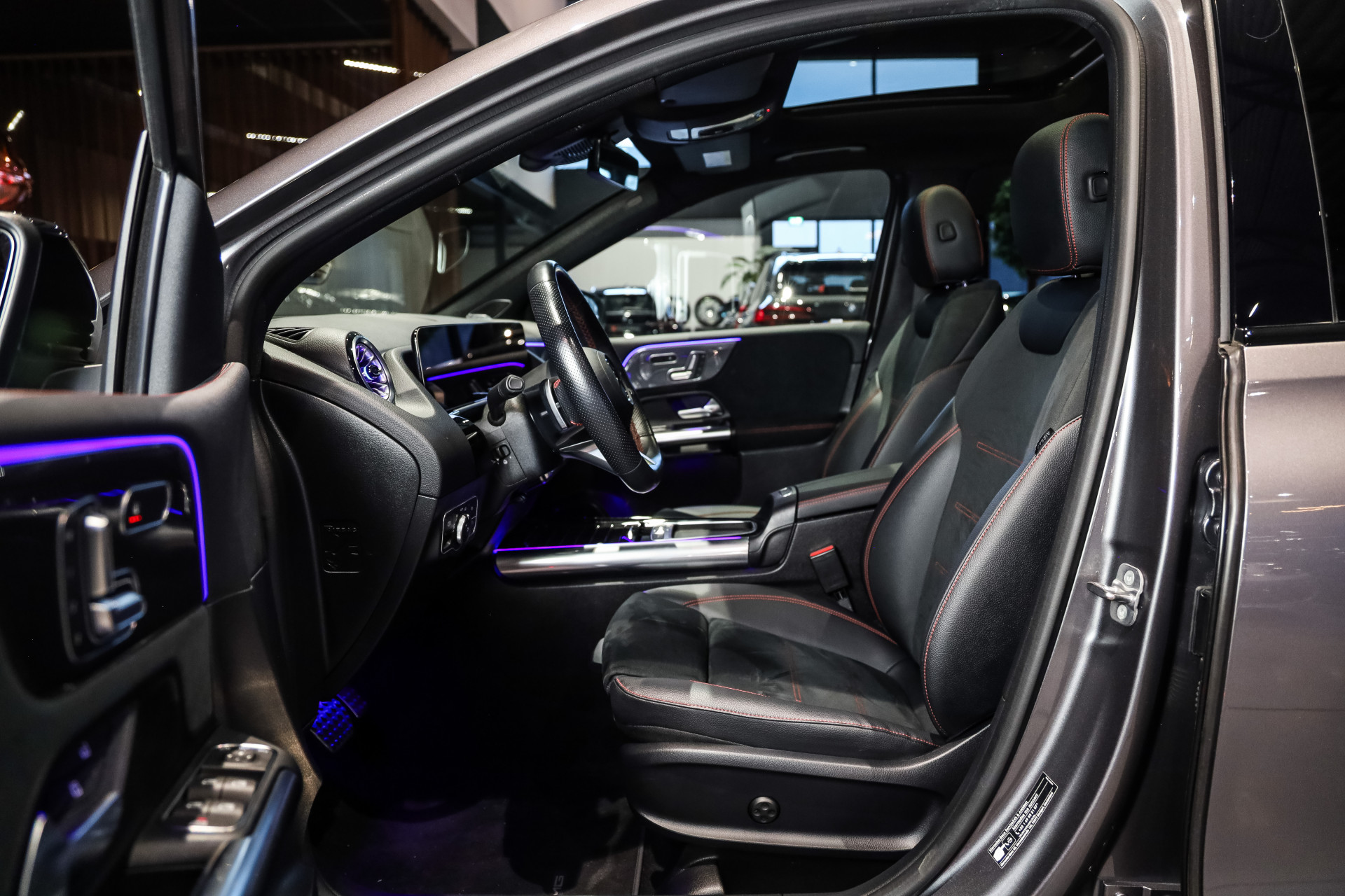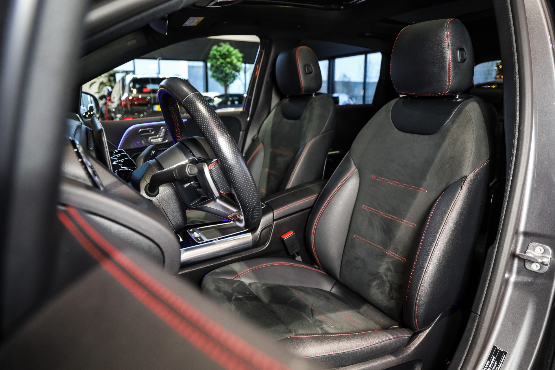 Uniek exemplaar voorzien van alle denkbare opties, inde mooie kleur combinatie mountain grey Metallic met zwart deel leder en rood stiksel.