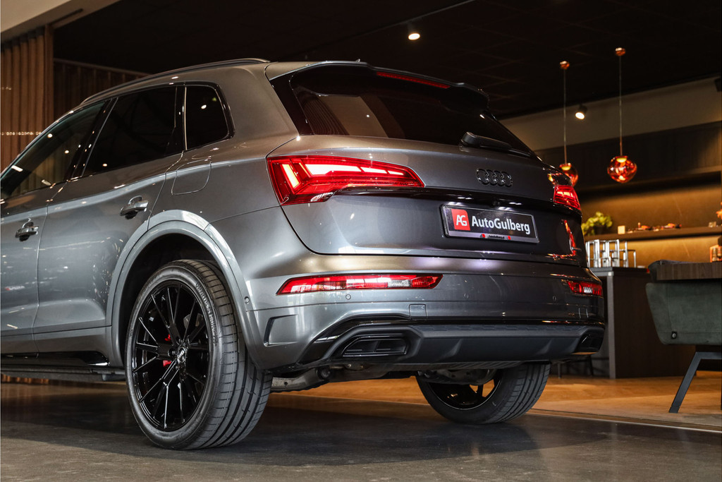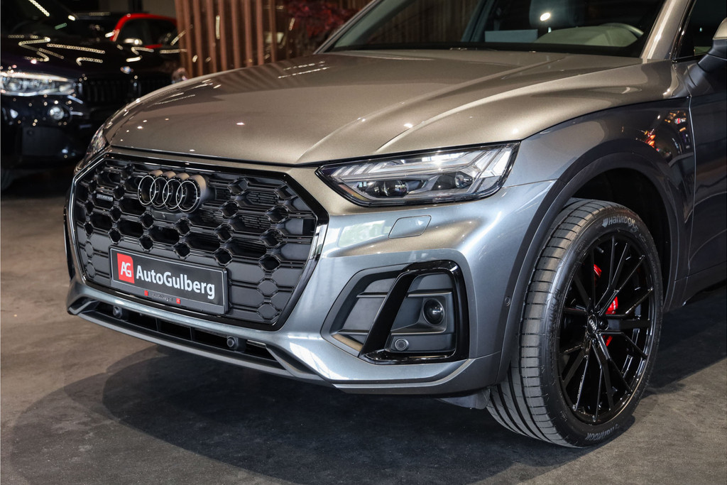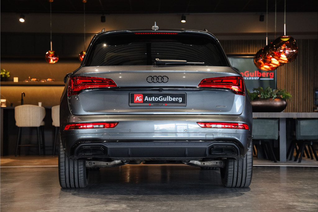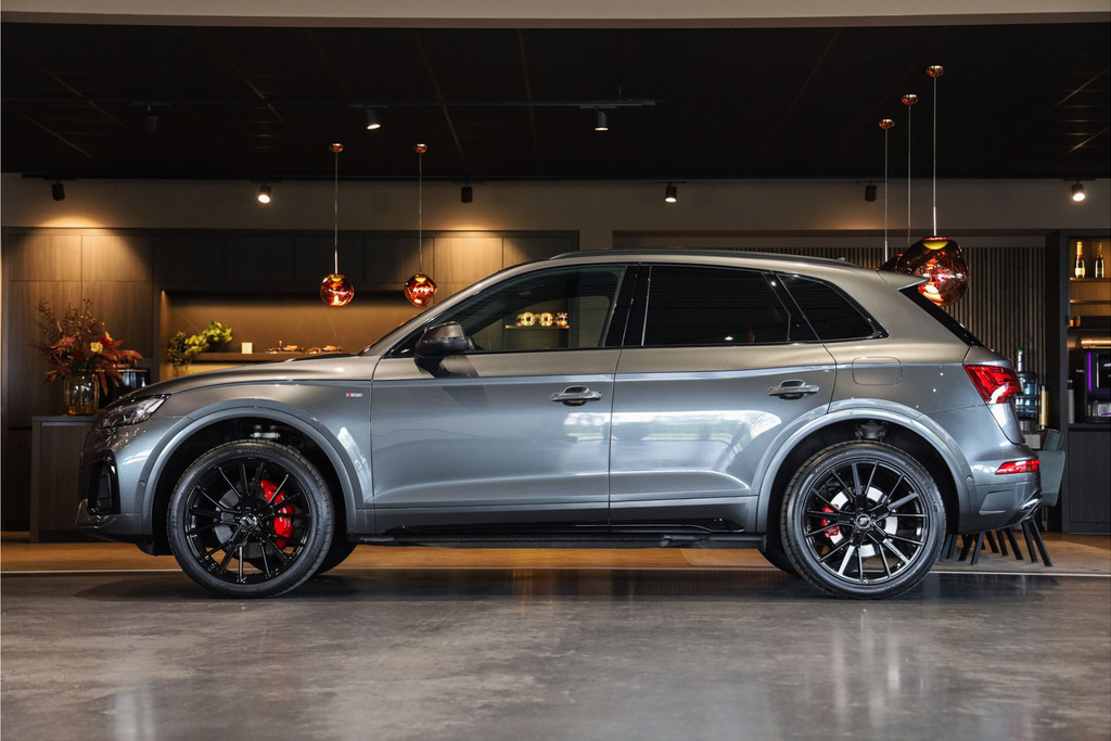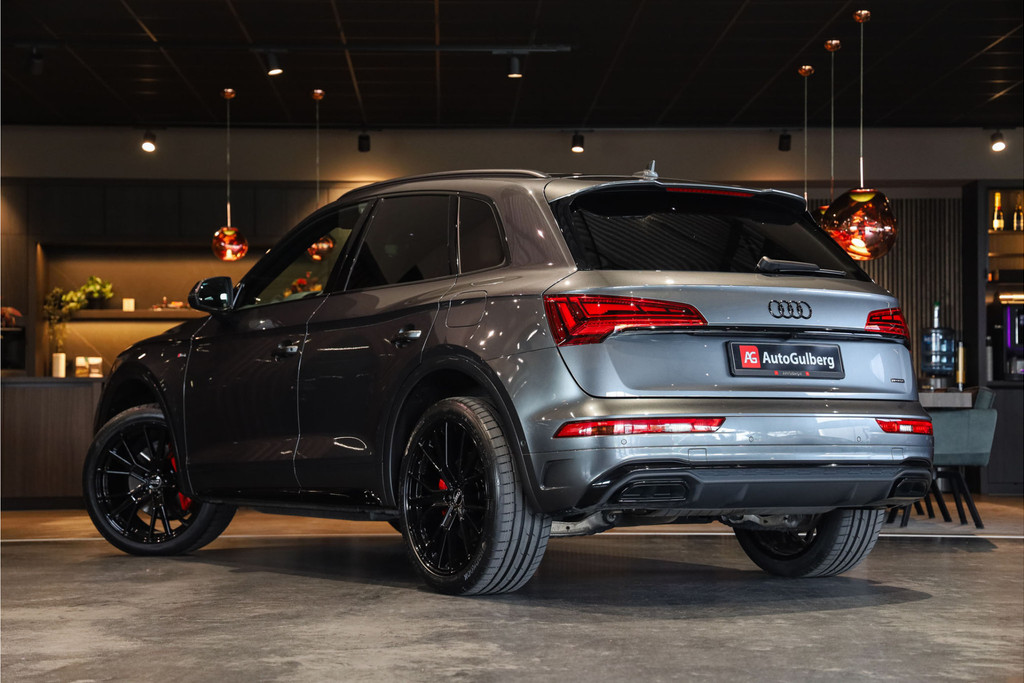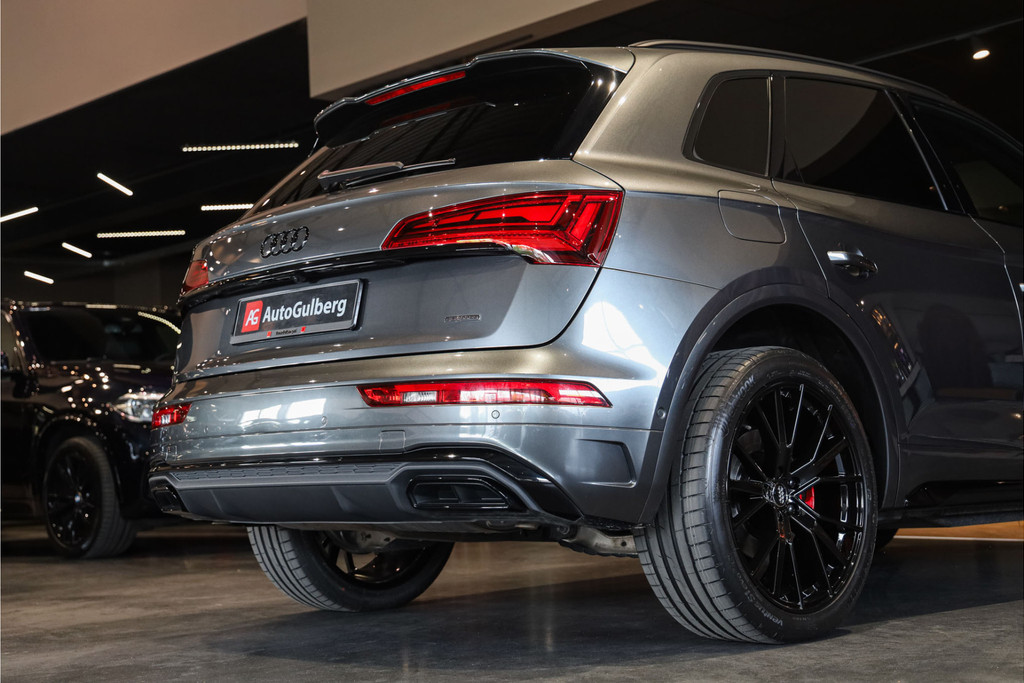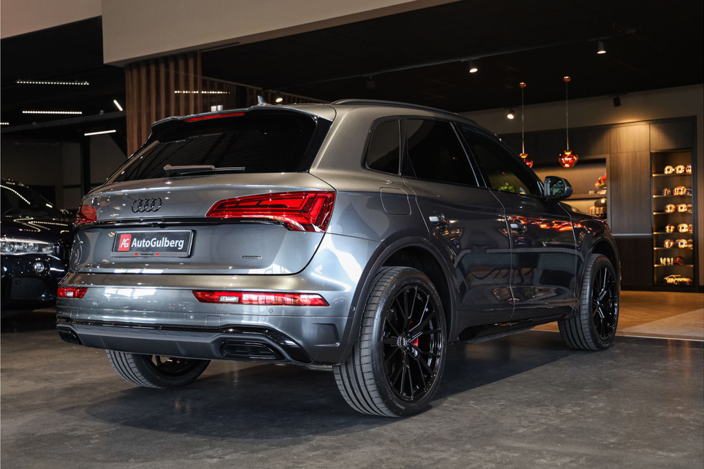 Complete Audi Q5 55 TFSI e Black Optic met slechts 51543km uitgevoerd in Daytona grijs pearl met zwarte hooglans accenten.