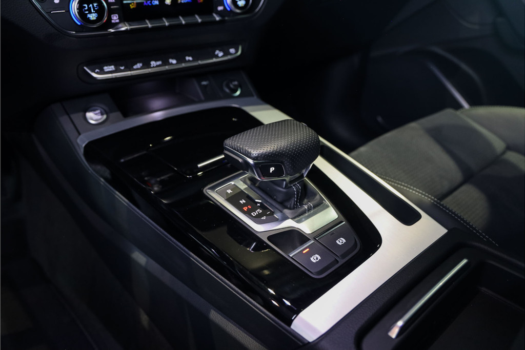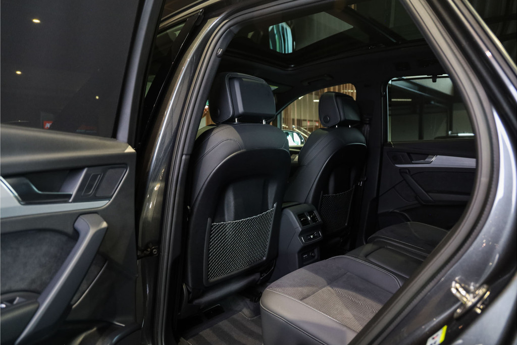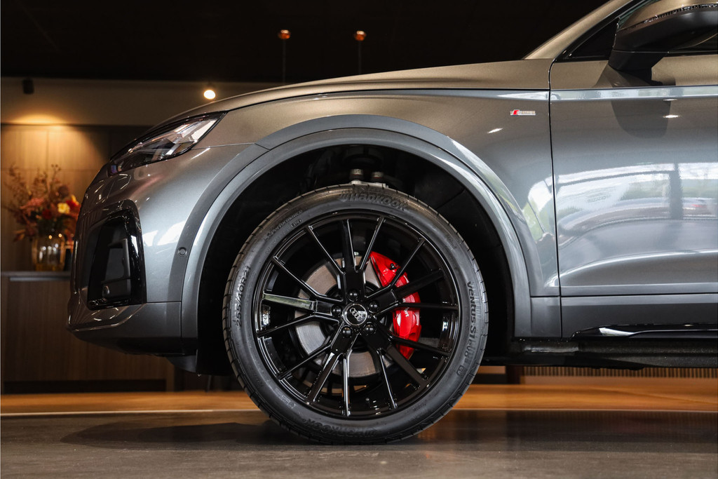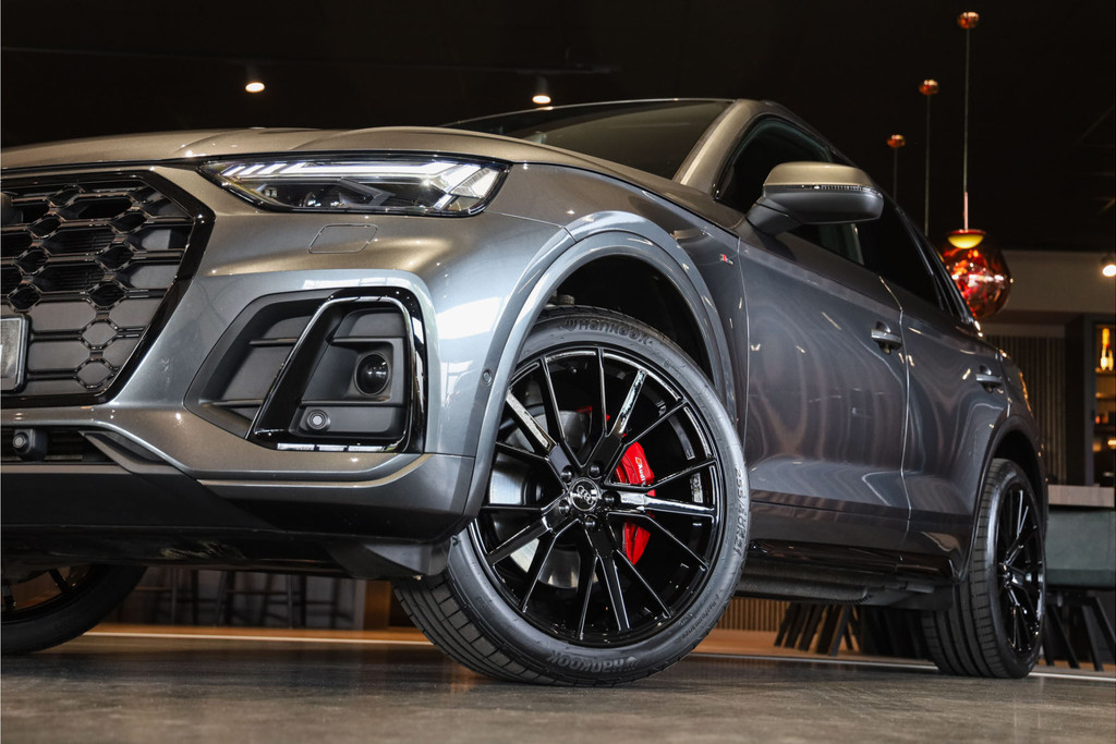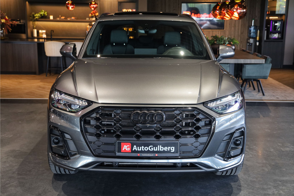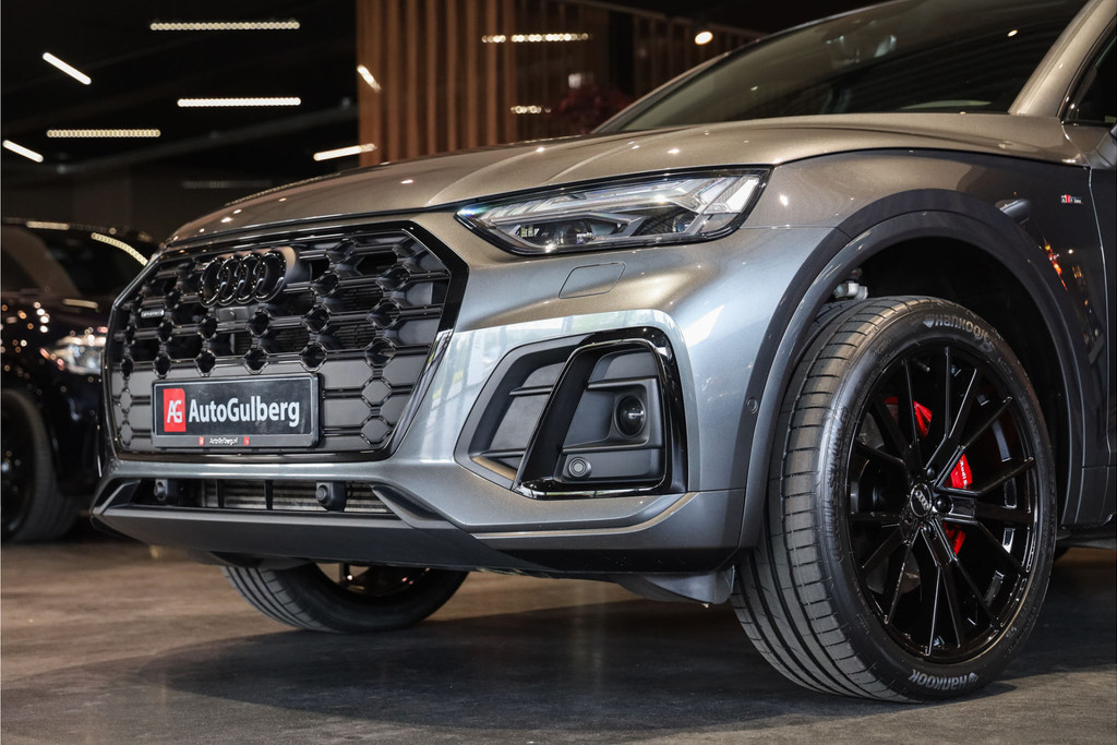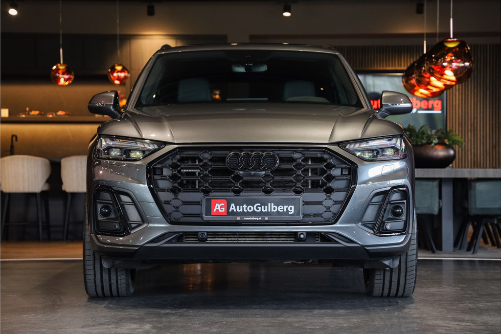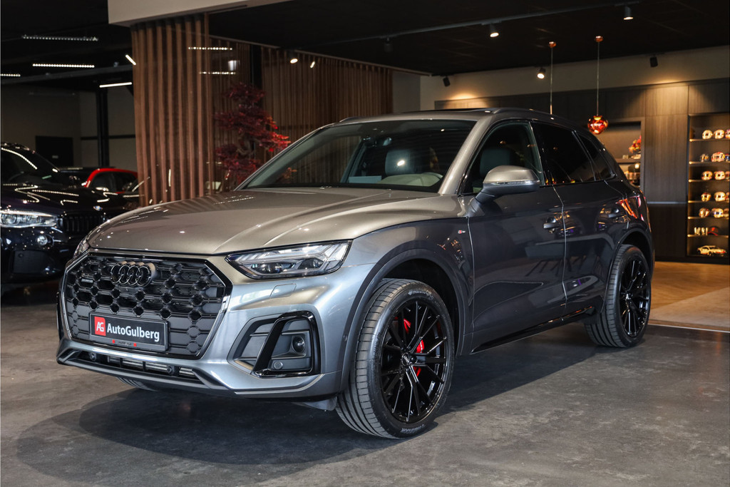 Complete Audi Q5 55 TFSI e Black Optic met slechts 51543km uitgevoerd in Daytona grijs pearl met zwarte hooglans accenten.