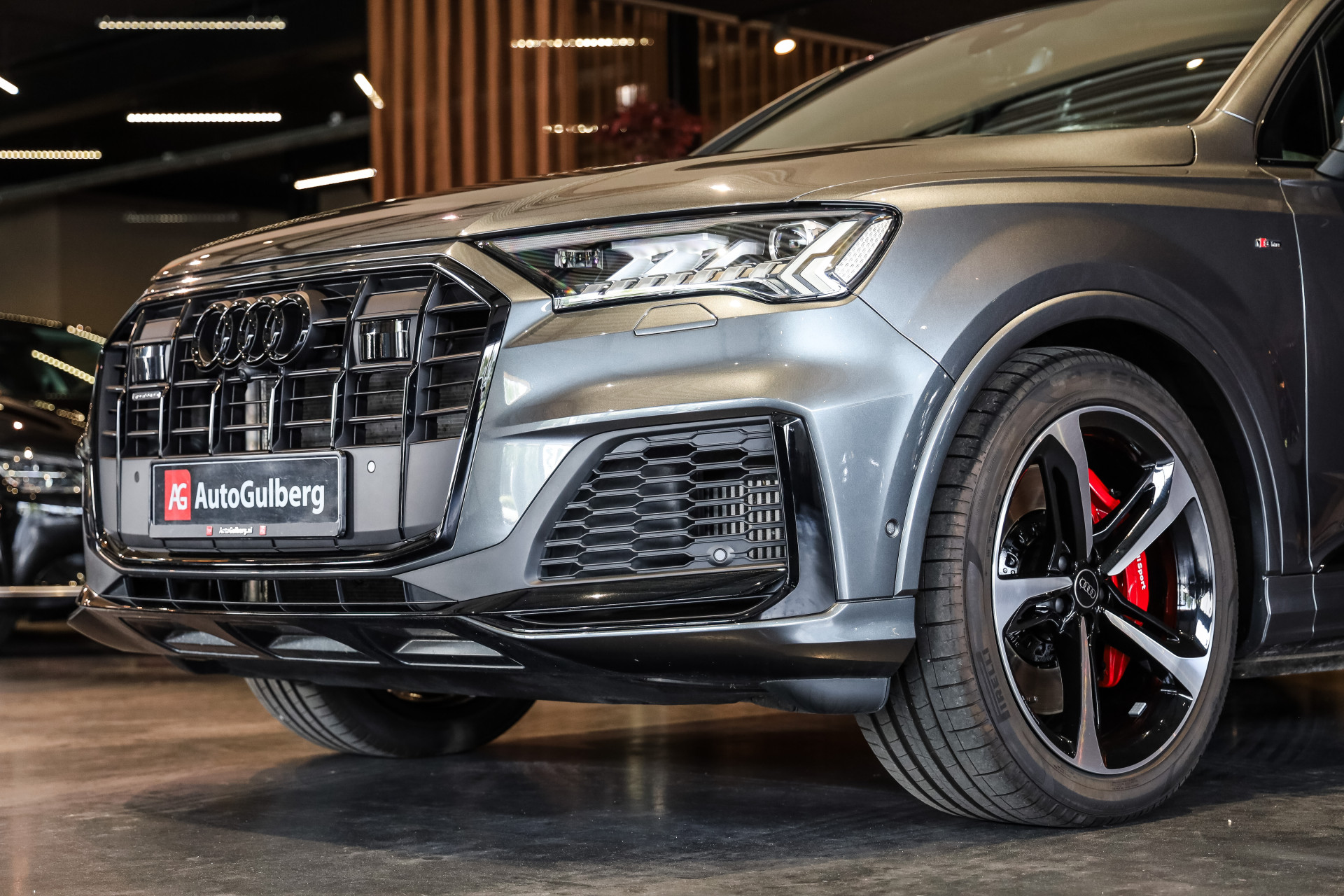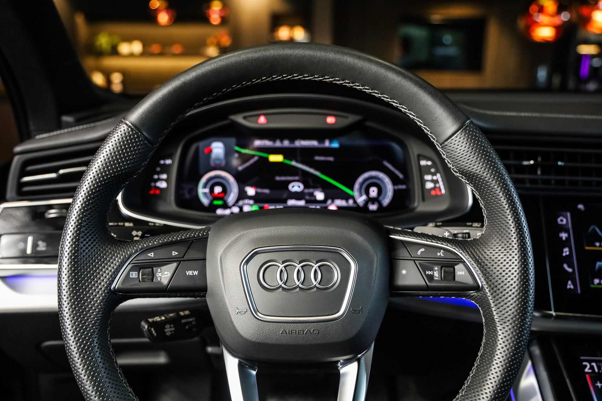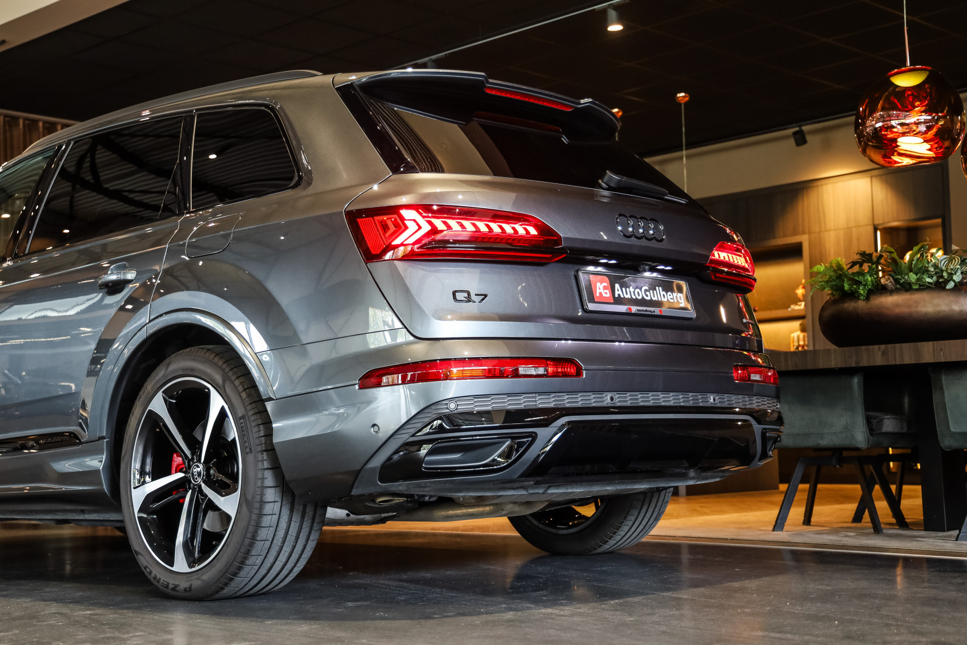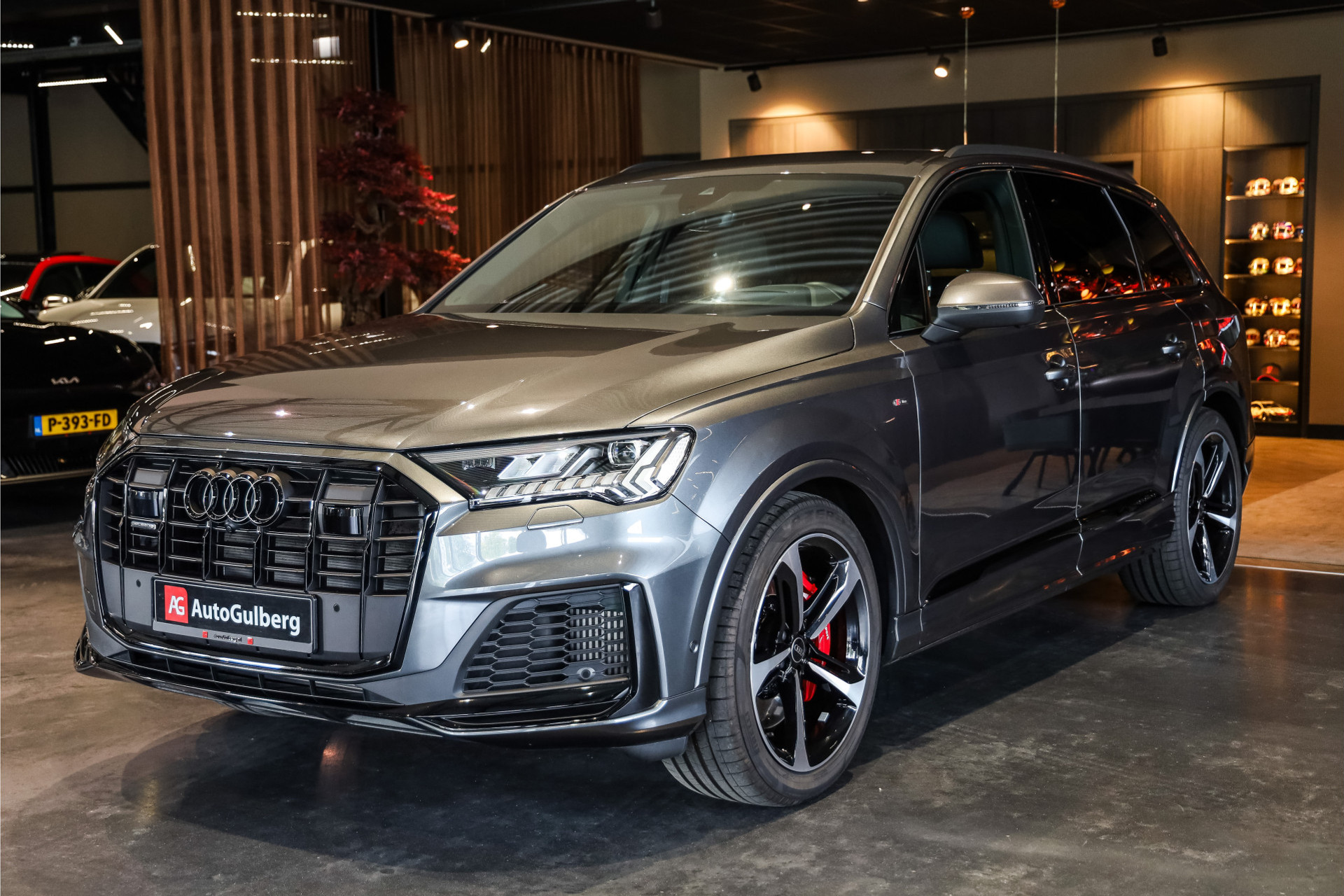 Hele mooie Audi Q7 55 TFSI e Quattro Black Optic in de kleur Daytona grijs metallic met zwart Leder / Alcantara.