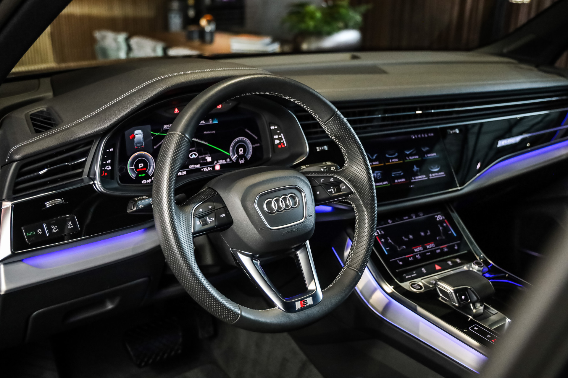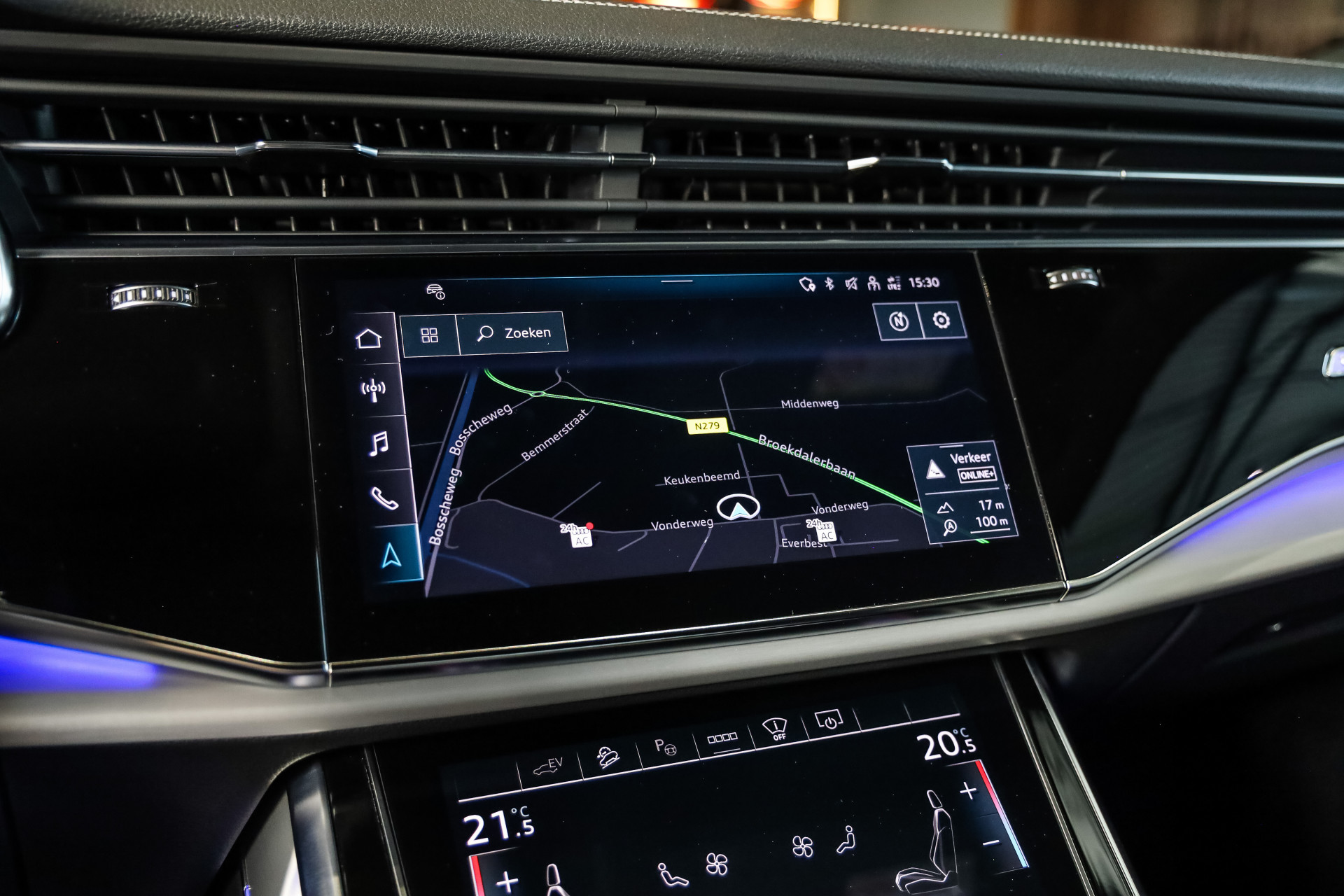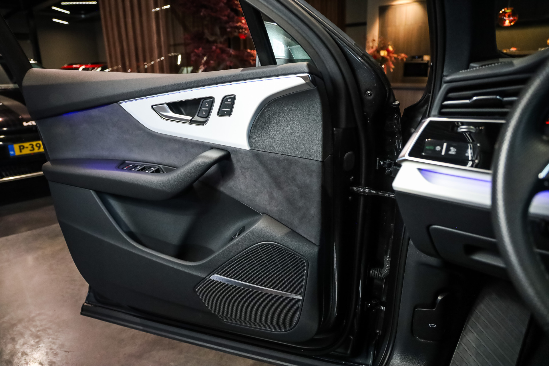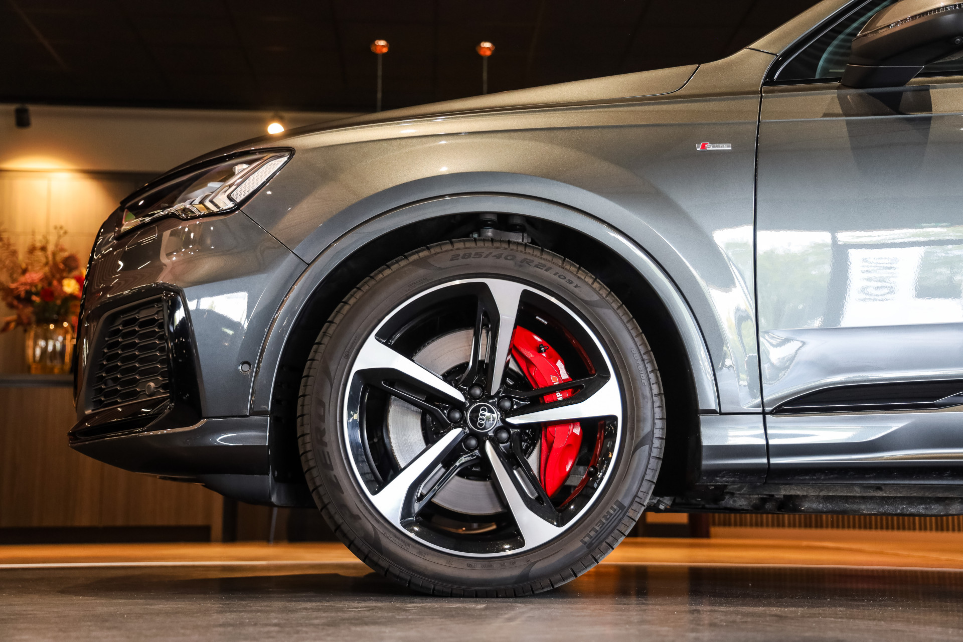 Hele mooie Audi Q7 55 TFSI e Quattro Black Optic in de kleur Daytona grijs metallic met zwart Leder / Alcantara.