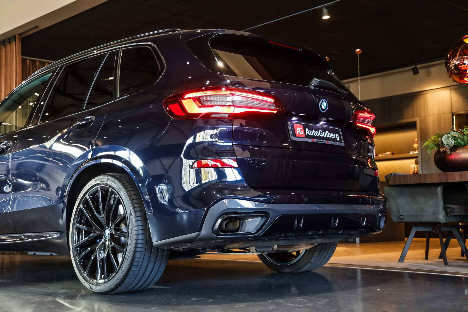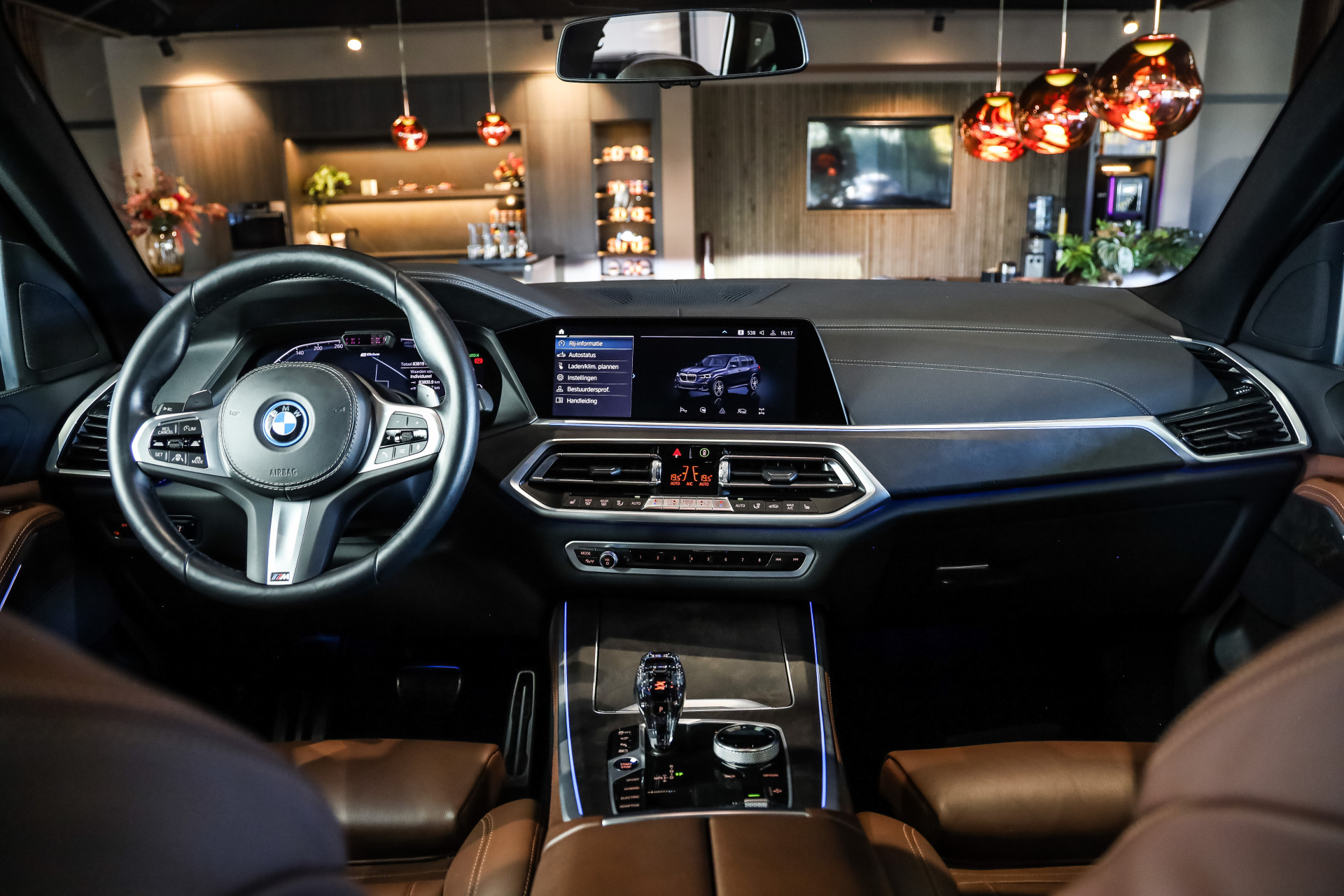 BMW X5 45e M-Sport in de kleur Carbonzwart met uitgebreid Merino leder pakket in de kleur Coffee, de buitenzijde is geheel afgewerkt in Black Optic accenten en velgen.