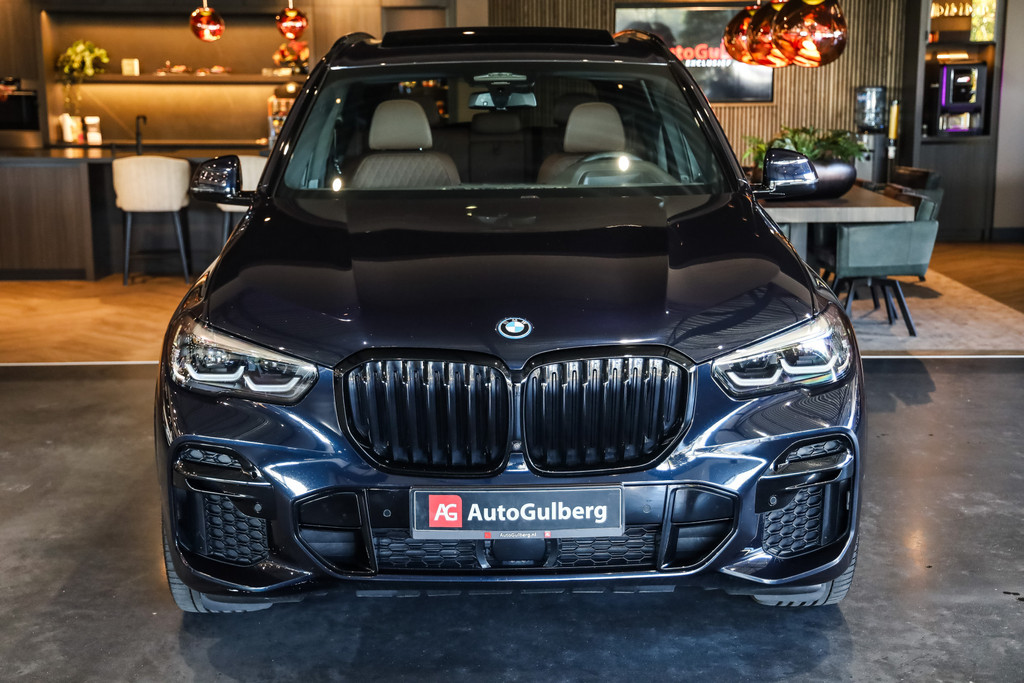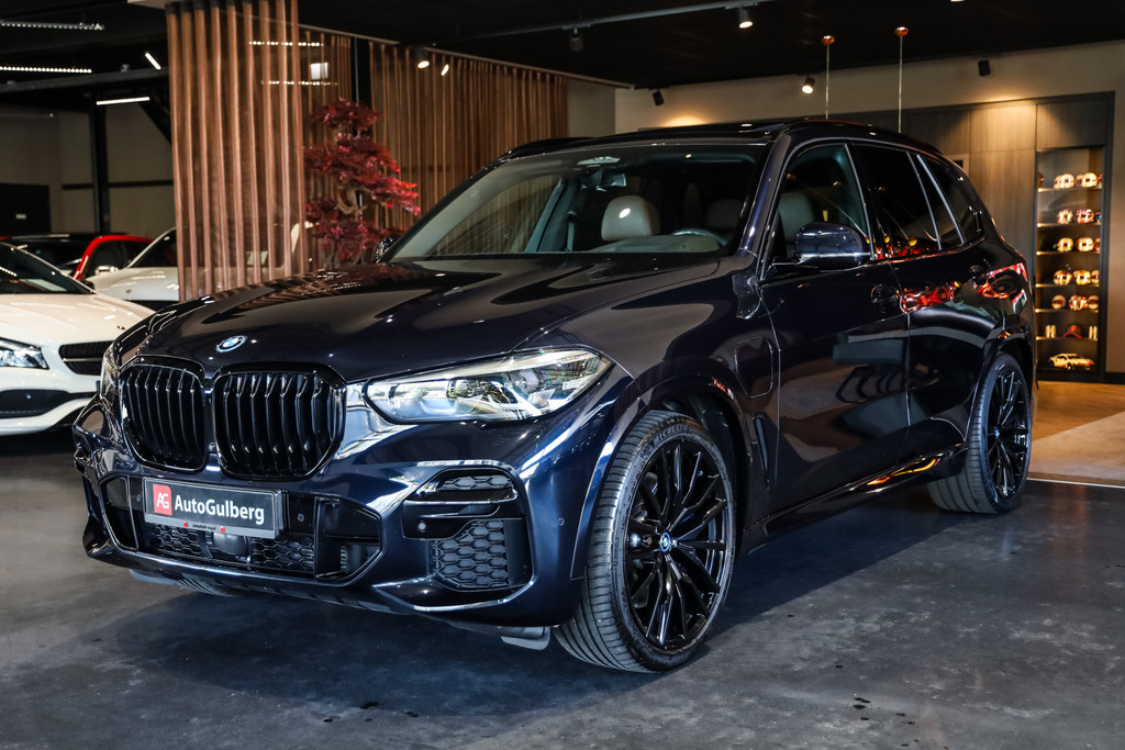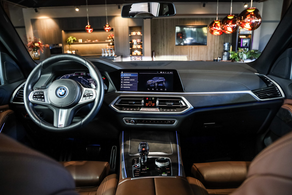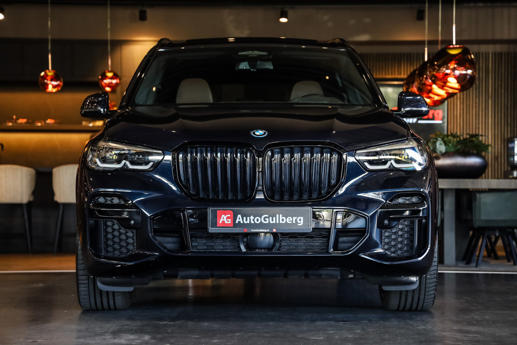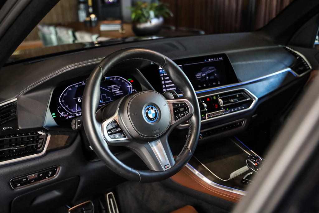 BMW X5 45e M-Sport in de kleur Carbonzwart met uitgebreid Merino leder pakket in de kleur Coffee, de buitenzijde is geheel afgewerkt in Black Optic accenten en velgen.