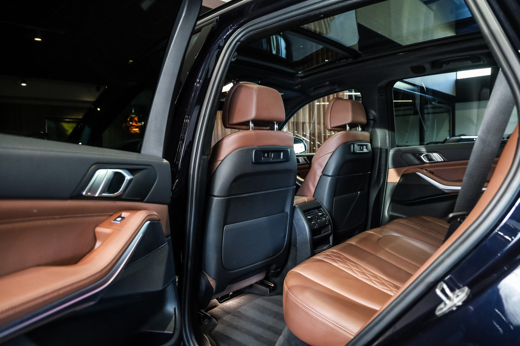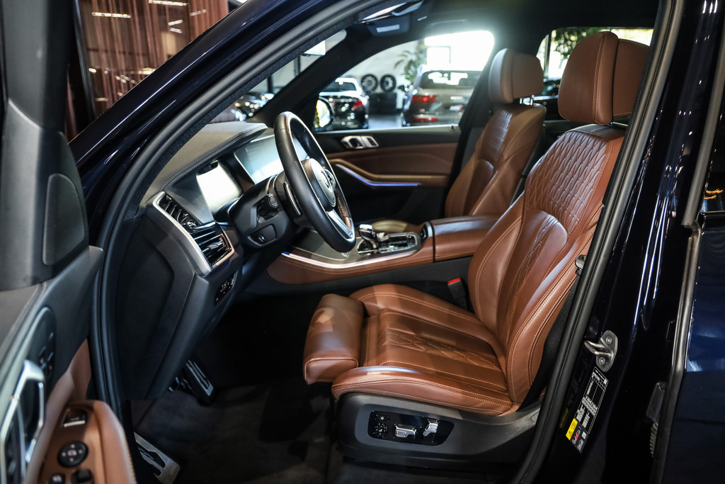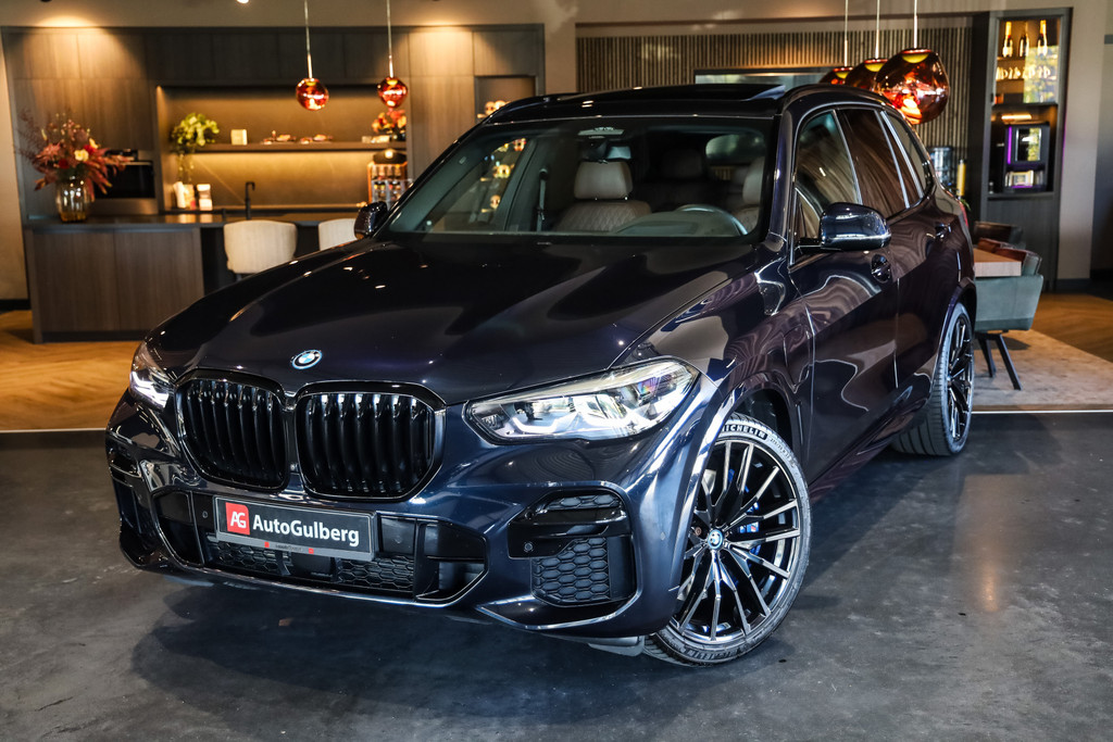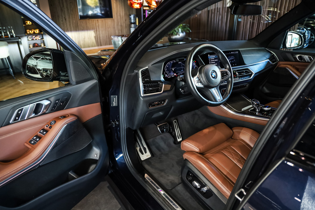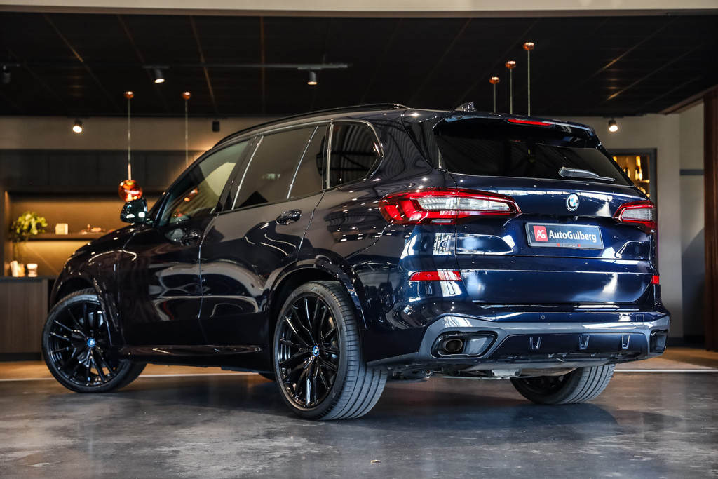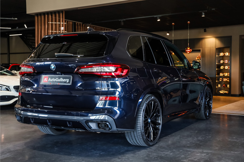 BMW X5 45e M-Sport in de kleur Carbonzwart met uitgebreid Merino leder pakket in de kleur Coffee, de buitenzijde is geheel afgewerkt in Black Optic accenten en velgen.
