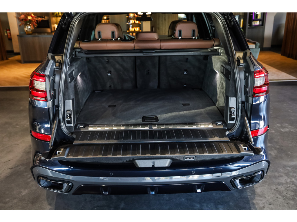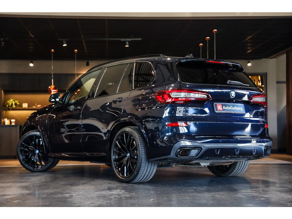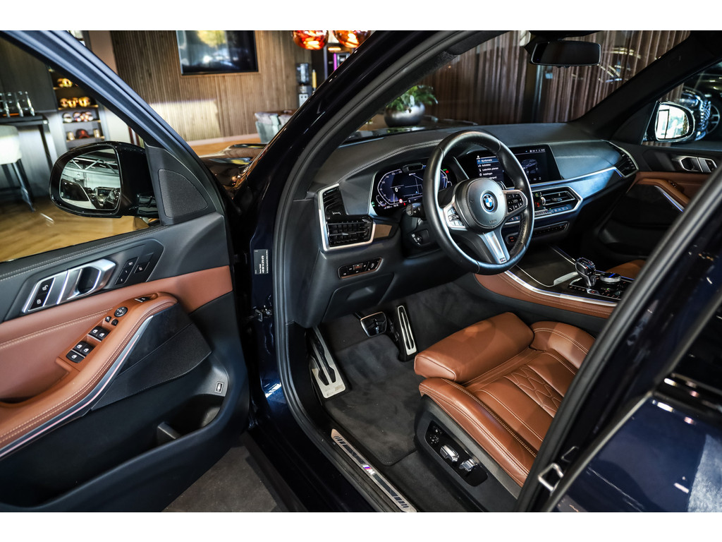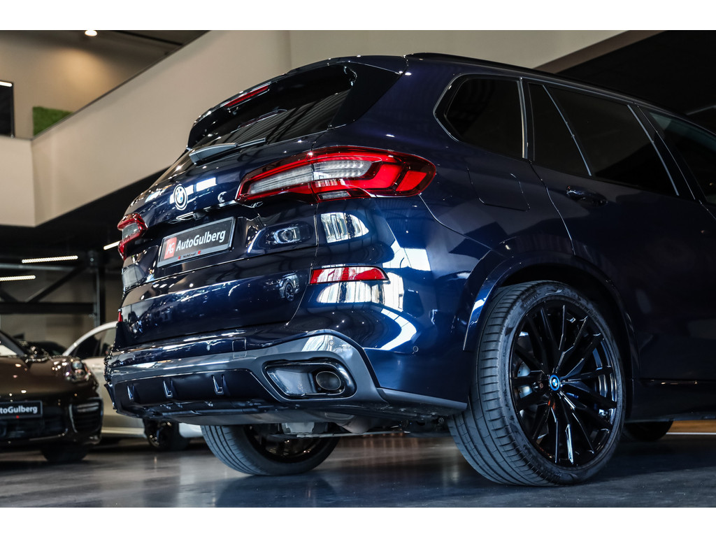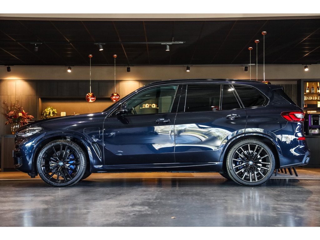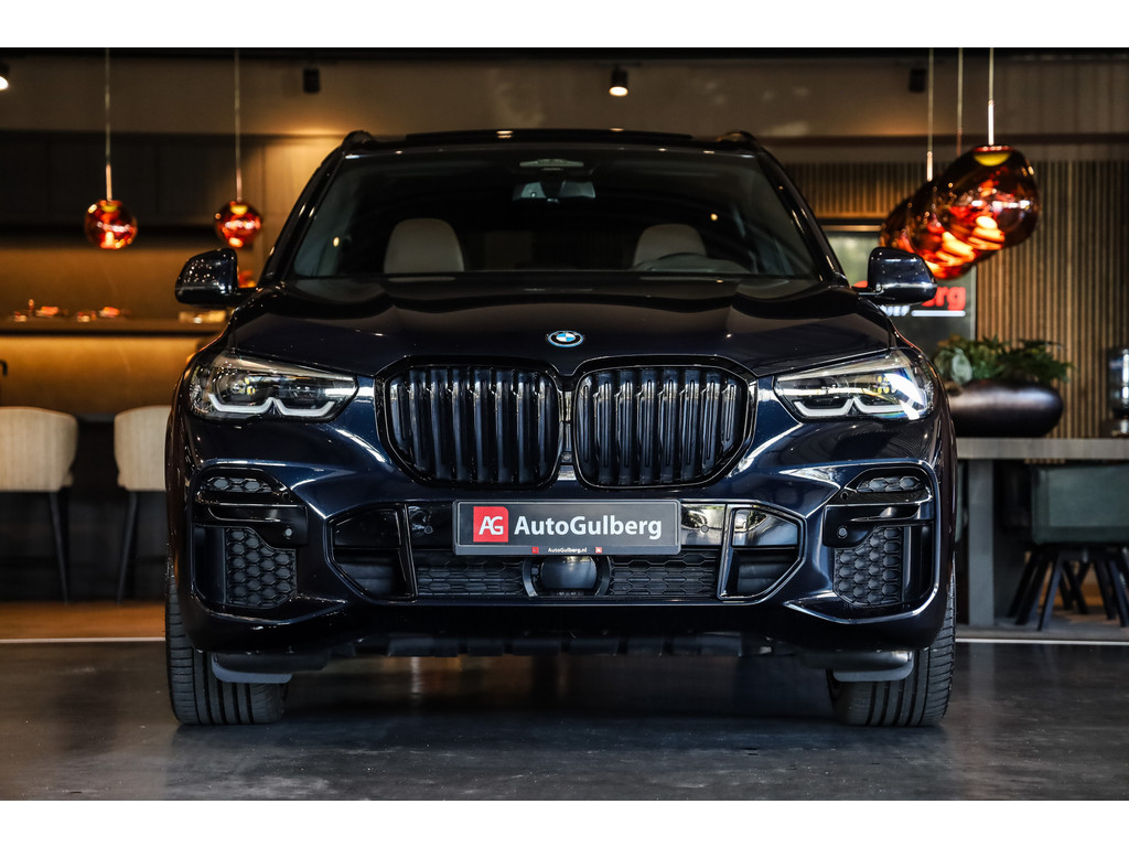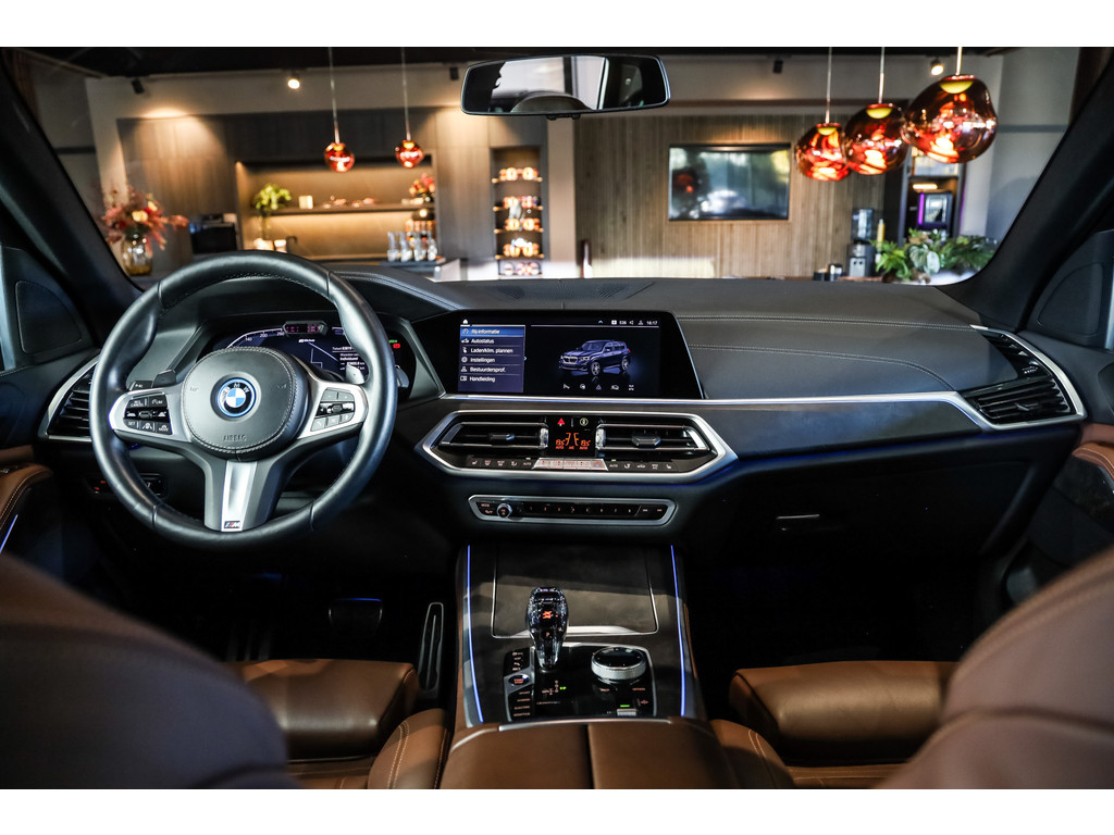BMW X5 45e M-Sport in de kleur Carbonzwart met uitgebreid Merino leder pakket in de kleur Coffee, de buitenzijde is geheel afgewerkt in Black Optic accenten en velgen.