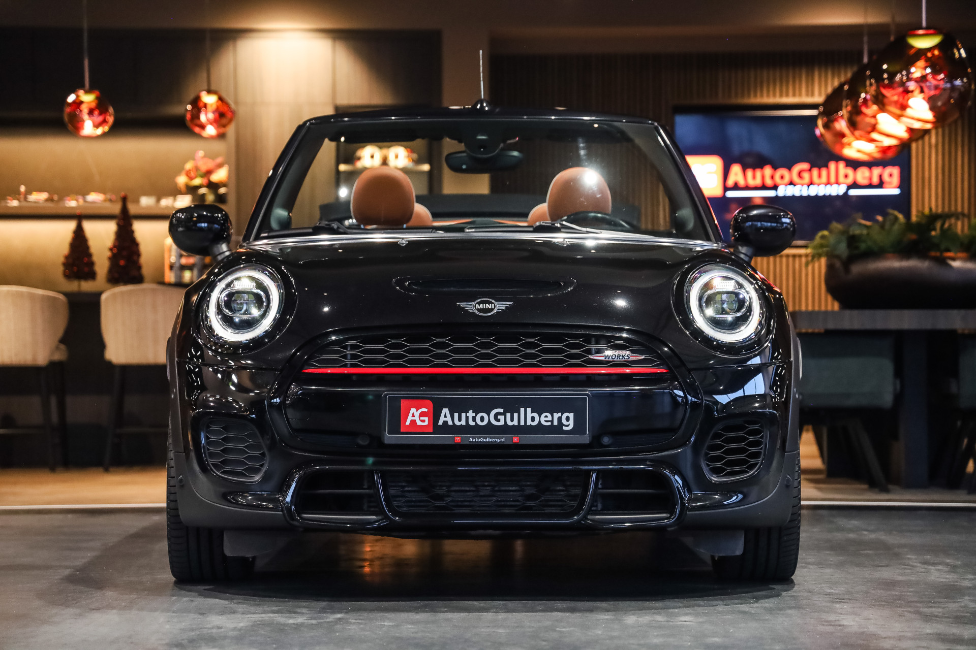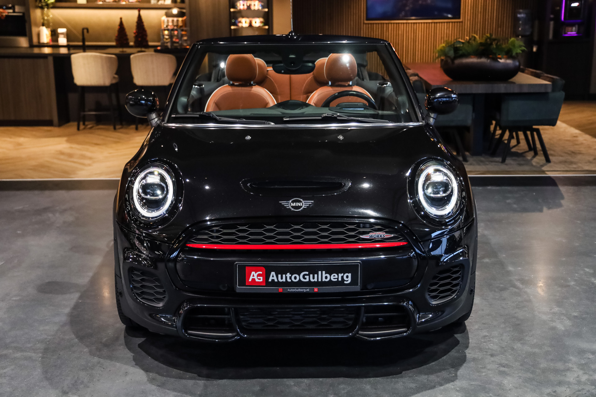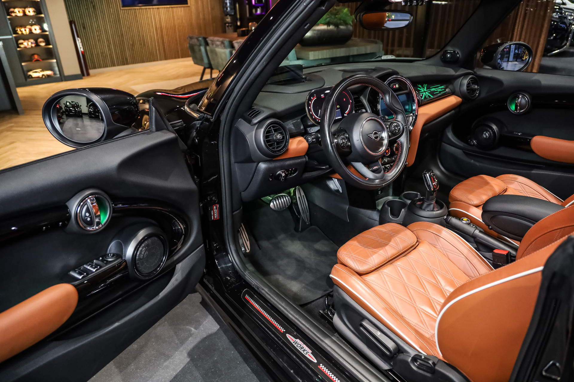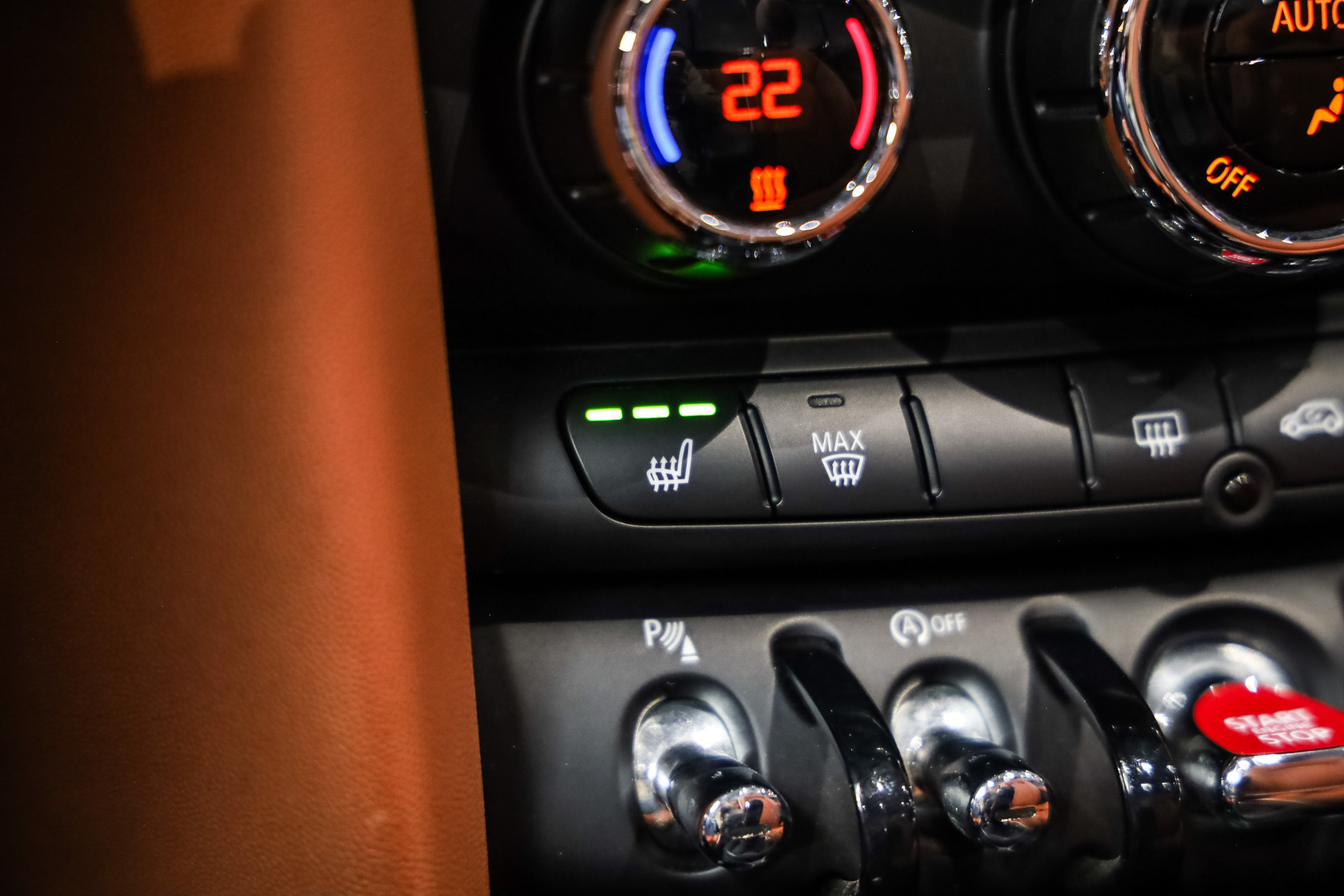 Uitzonderlijk mooie rijk uitgeruste Mini Cooper Works Chili 231PK, uitgevoerd in Midnight Black metallic en voorzien van vol Leder Chester/malt Brown.
