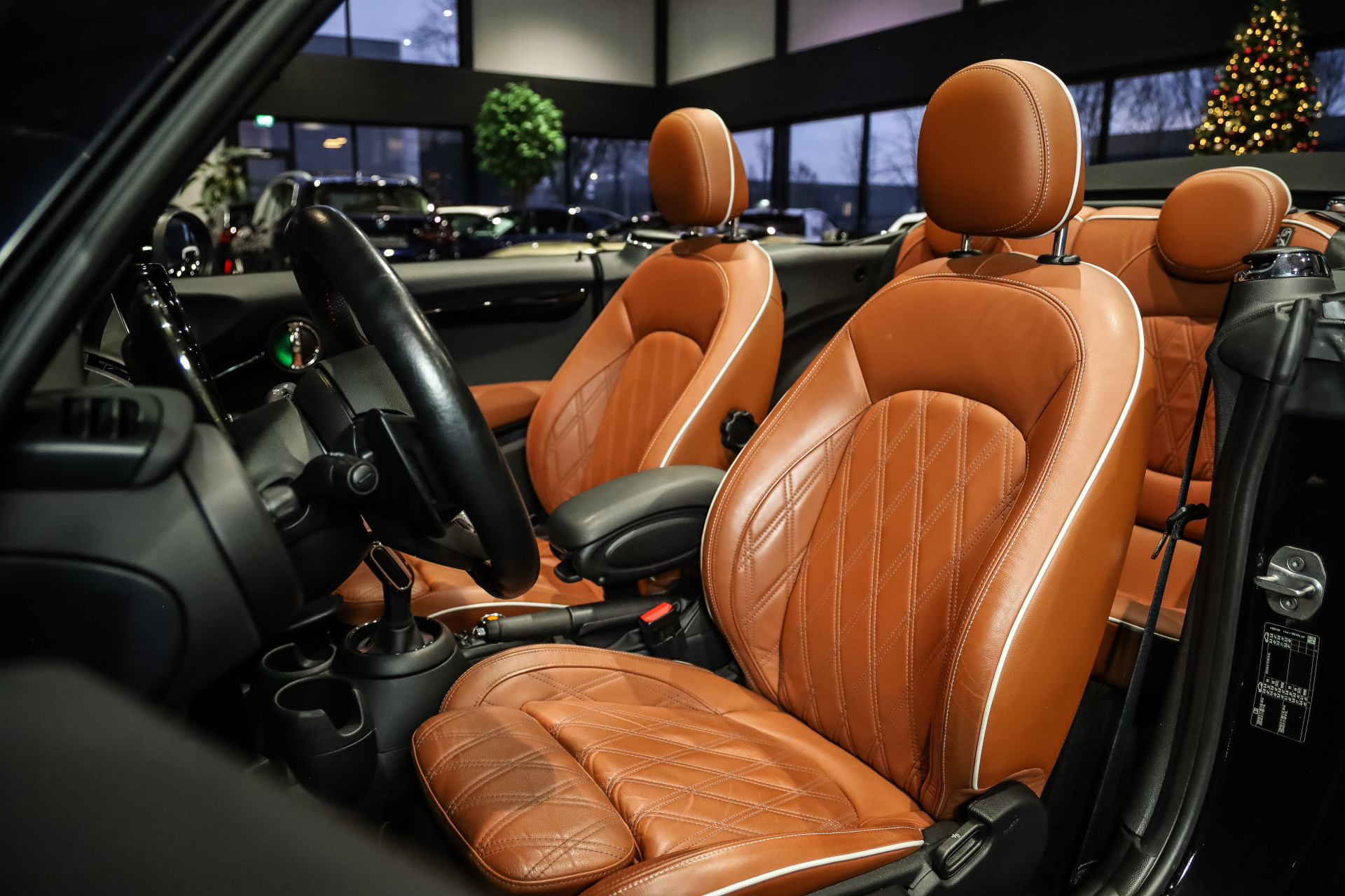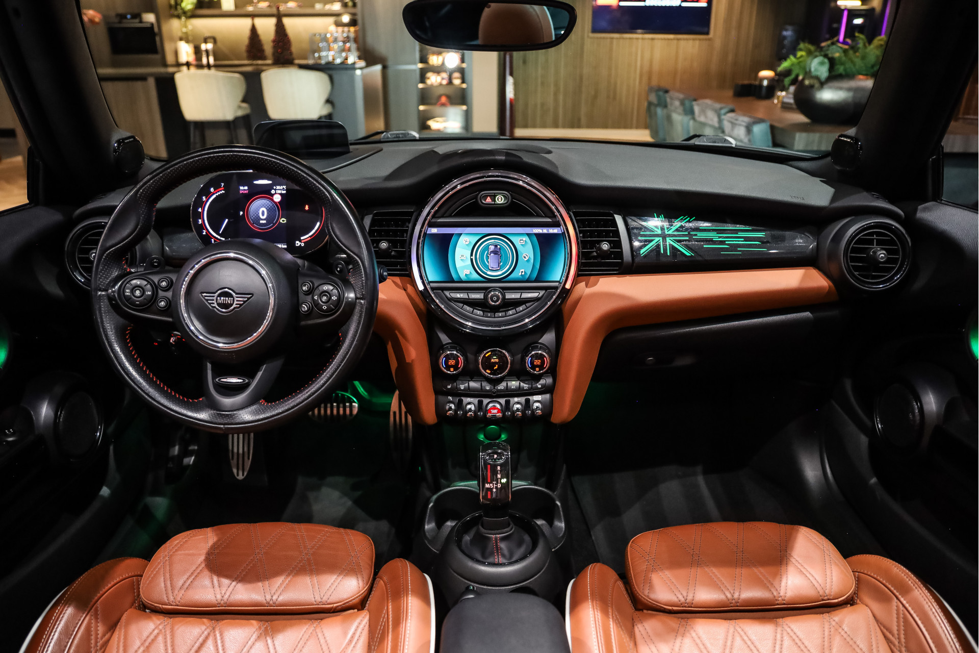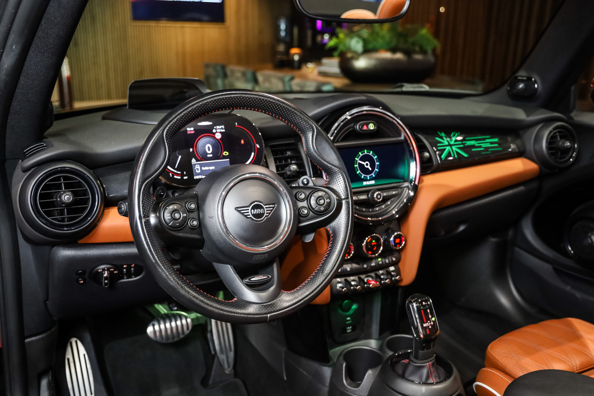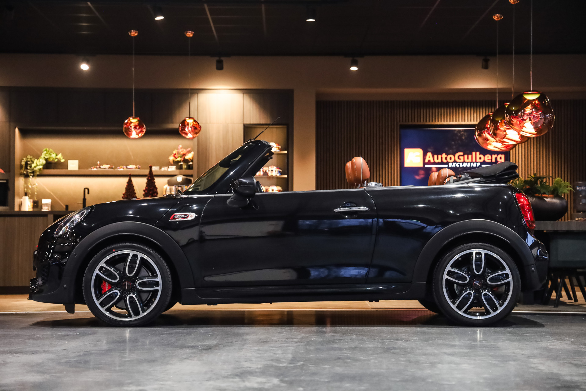 Uitzonderlijk mooie rijk uitgeruste Mini Cooper Works Chili 231PK, uitgevoerd in Midnight Black metallic en voorzien van vol Leder Chester/malt Brown.