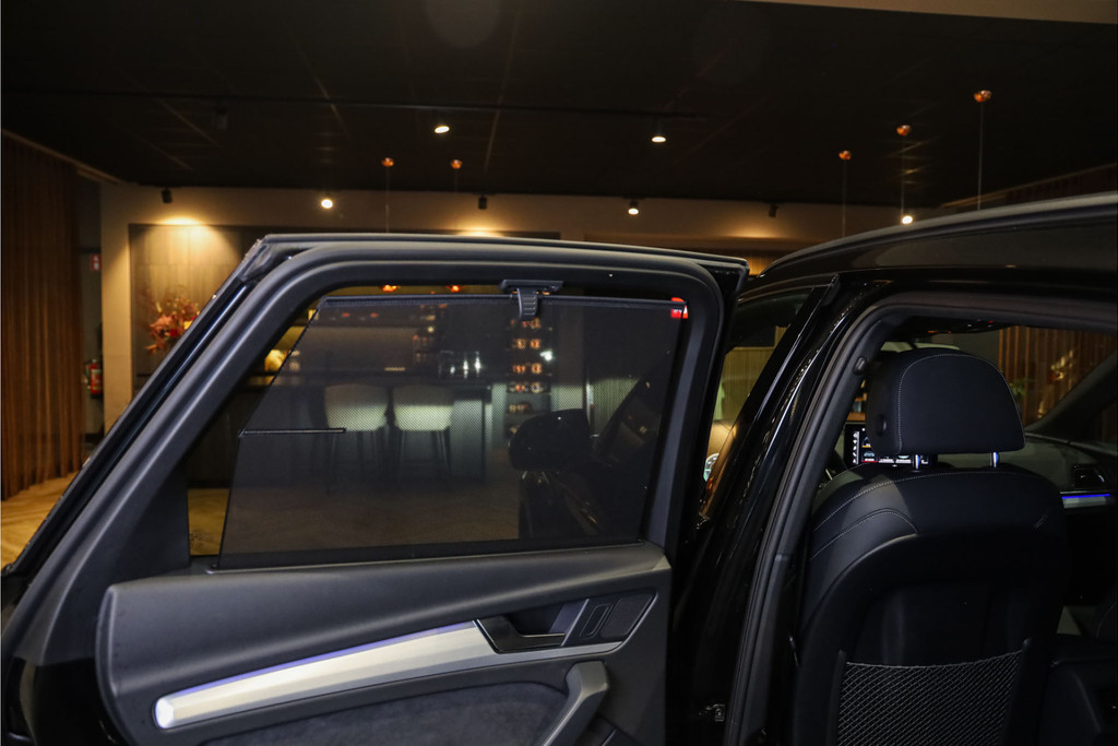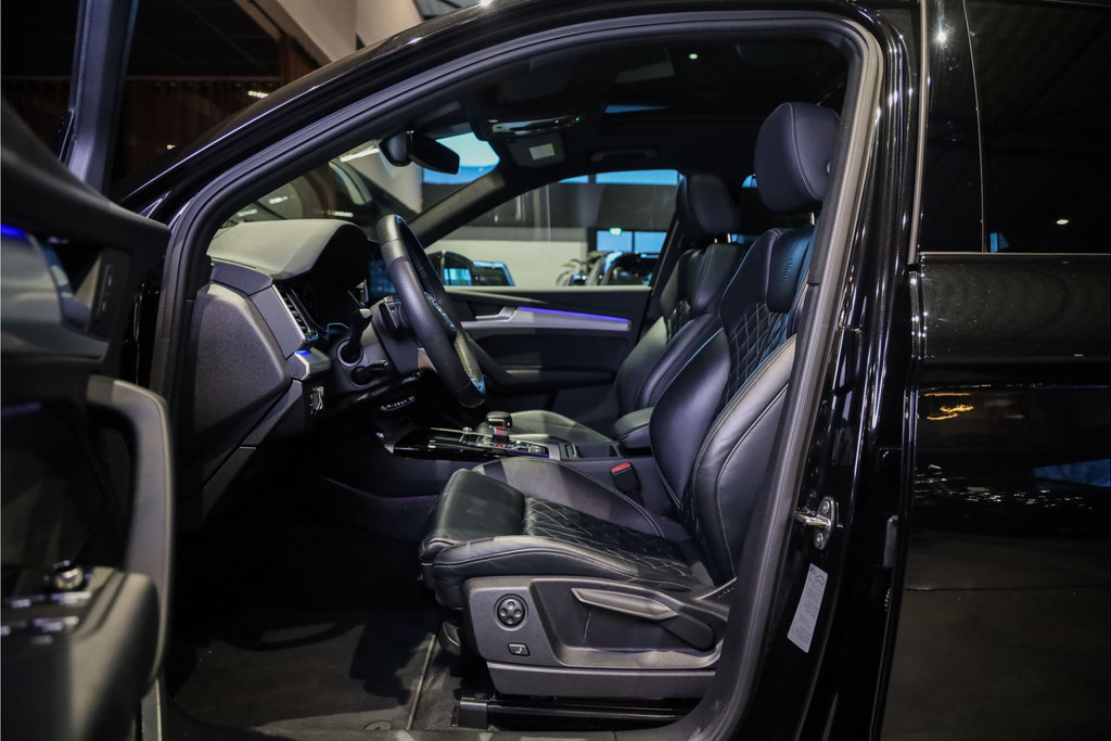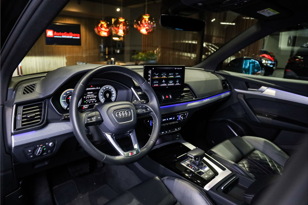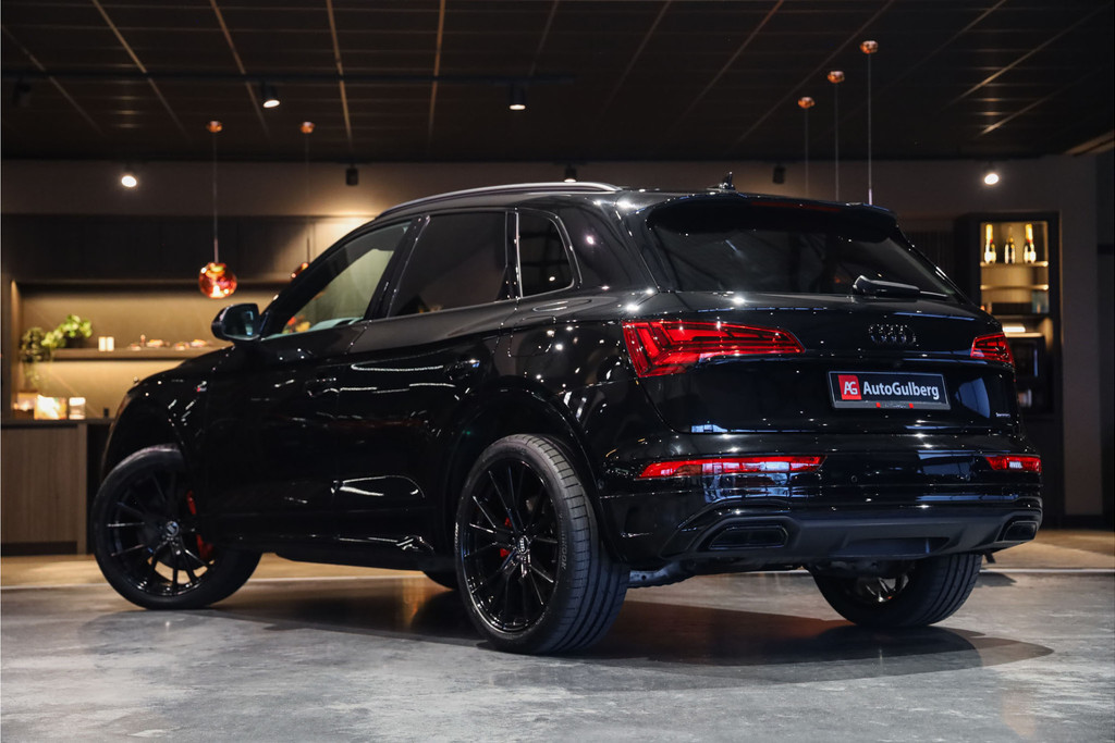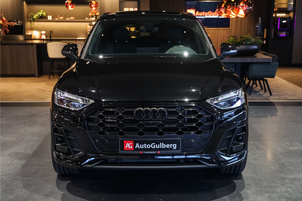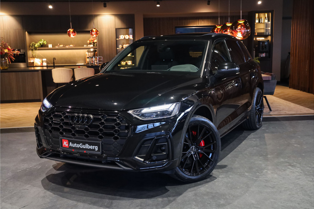 Audi Q5 55 TFSI e 3x S-line geheel uitgevoerd in Mythos zwart metallic met zwart nappa leder met ruit stiksel Black Optic accenten.